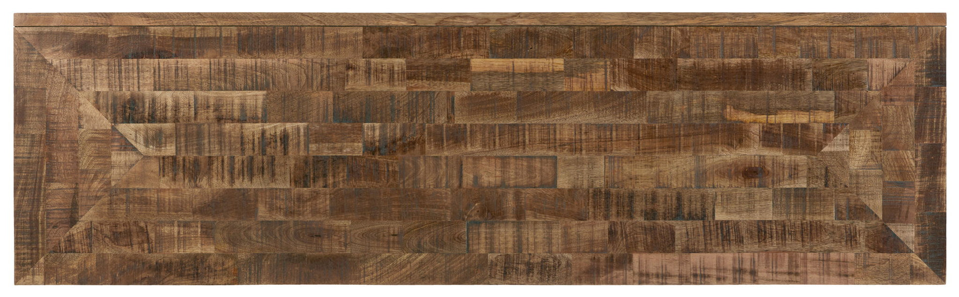 Crafted of Solid Wood Mango with a patterned veneer design and organic color palette, the 64-inch entertainment console offers stylish storage for clutter-free entertainment. Accommodating up to a 65-inch TV, the piece offers wire management and 3 doors with touch-latch operation. The left side set of doors has a center partition.