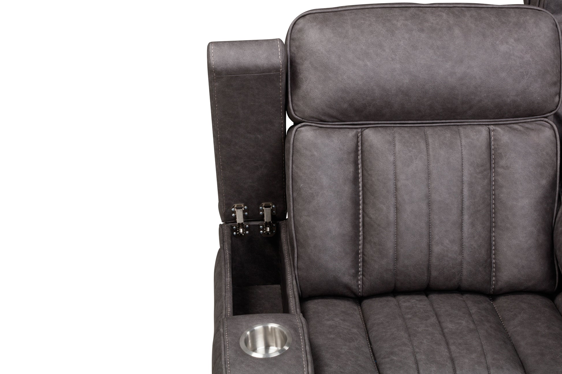 Spice up your movie nights with the Equinox Sofa Group. Each power seat features armrest storage and independently operating power headrests for personalized comfort. Equinox's sofa features an ultra convenient drop-down table in the back of the middle seat, offering cup holders, charging, and overhead lights alongside its always-appreciated table surface space. Cool blue ambient floor lights at the bases, upholstered channels on the back and leg rests and oversized welt cord ensure that Equinox is the best looking seat in the house!