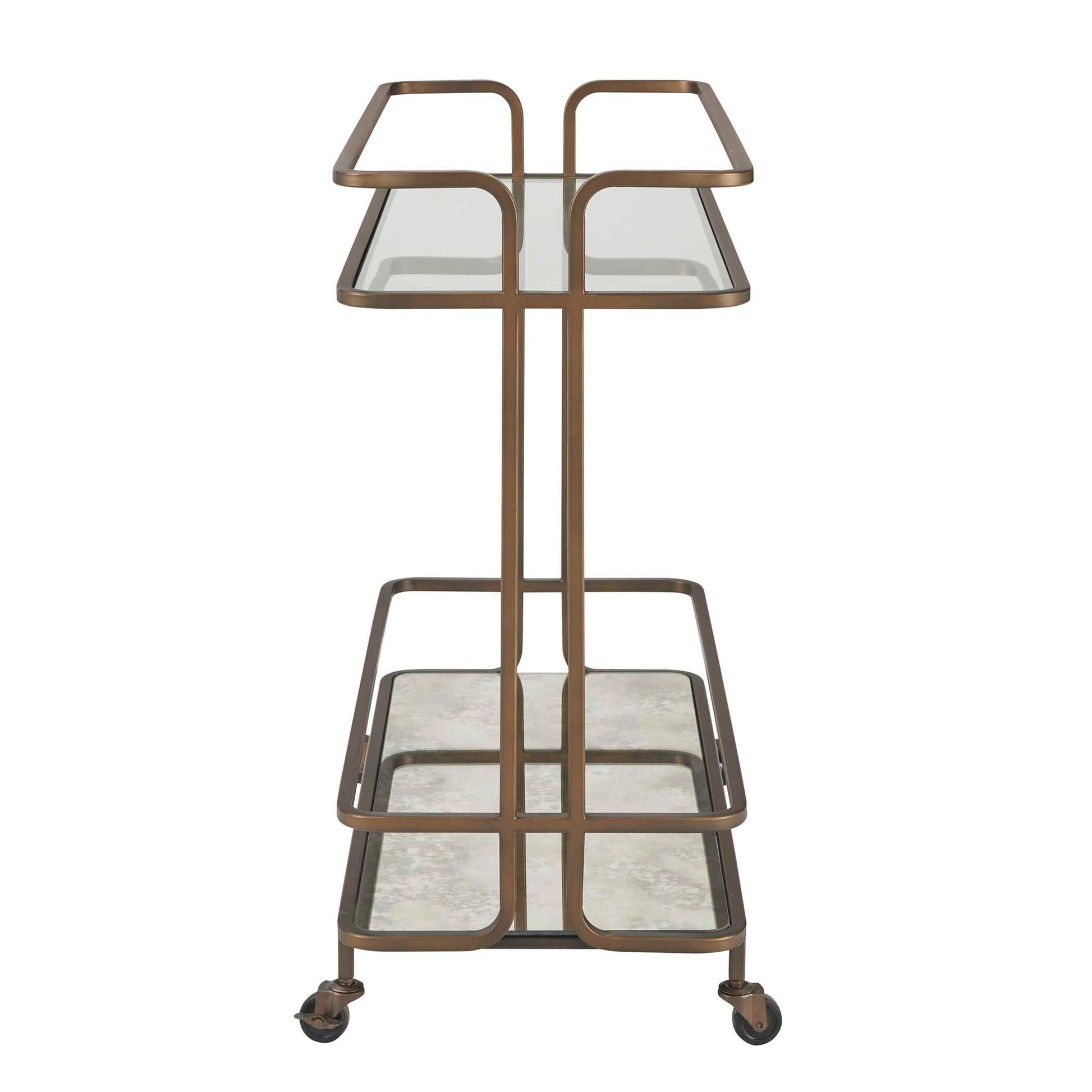 A Bronze Frame Cradles Both A Clear Glass Top And An Antique Style Mirrored Base, Offering An Unobstructed View Of Your Curated Drink Collection. Complete With Rolling And Locking Casters.