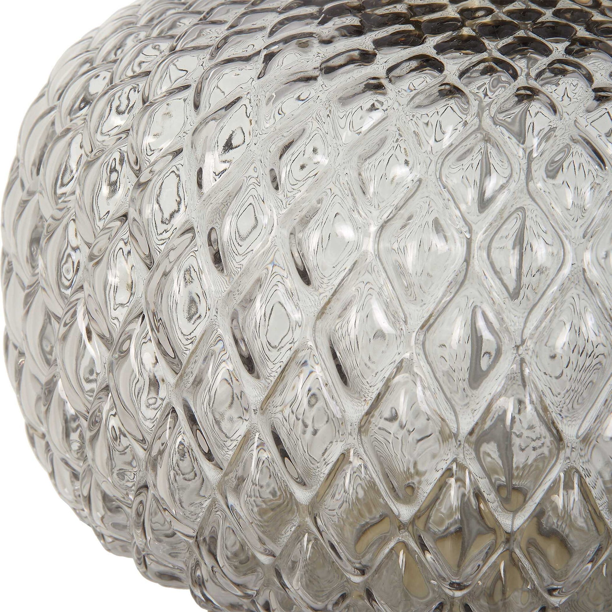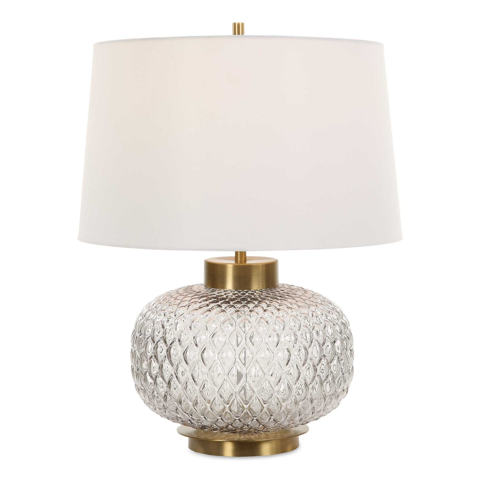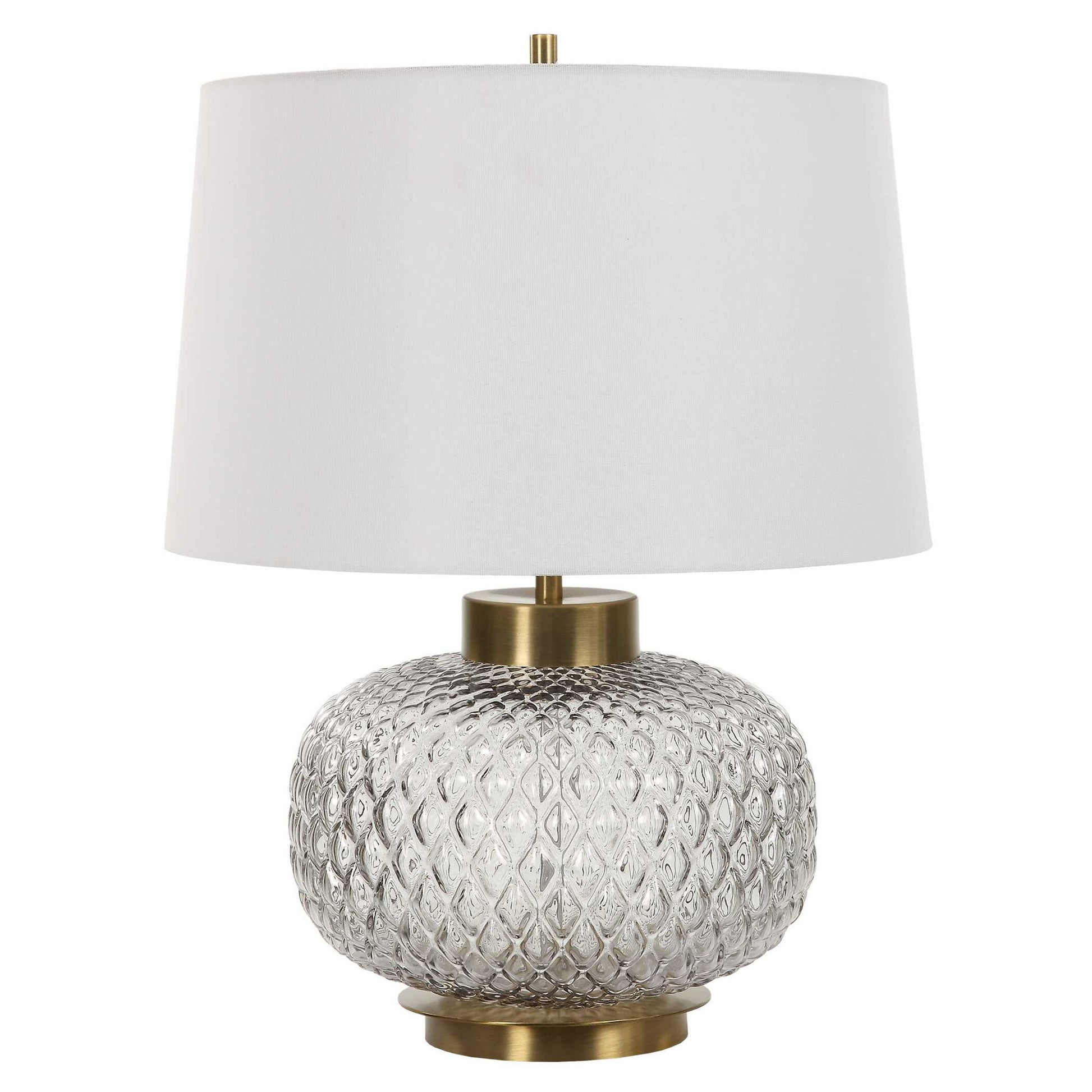 The Estelle Table Lamp Features A Heavily Embossed, Round Lattice Inspired, Light Smoke-gray Glass Base Accented By A Chunky Antique Brass Foot And Hardware. The Slightly Tapered Round Hardback Shade Is Covered In A Crisp White Linen Fabric.