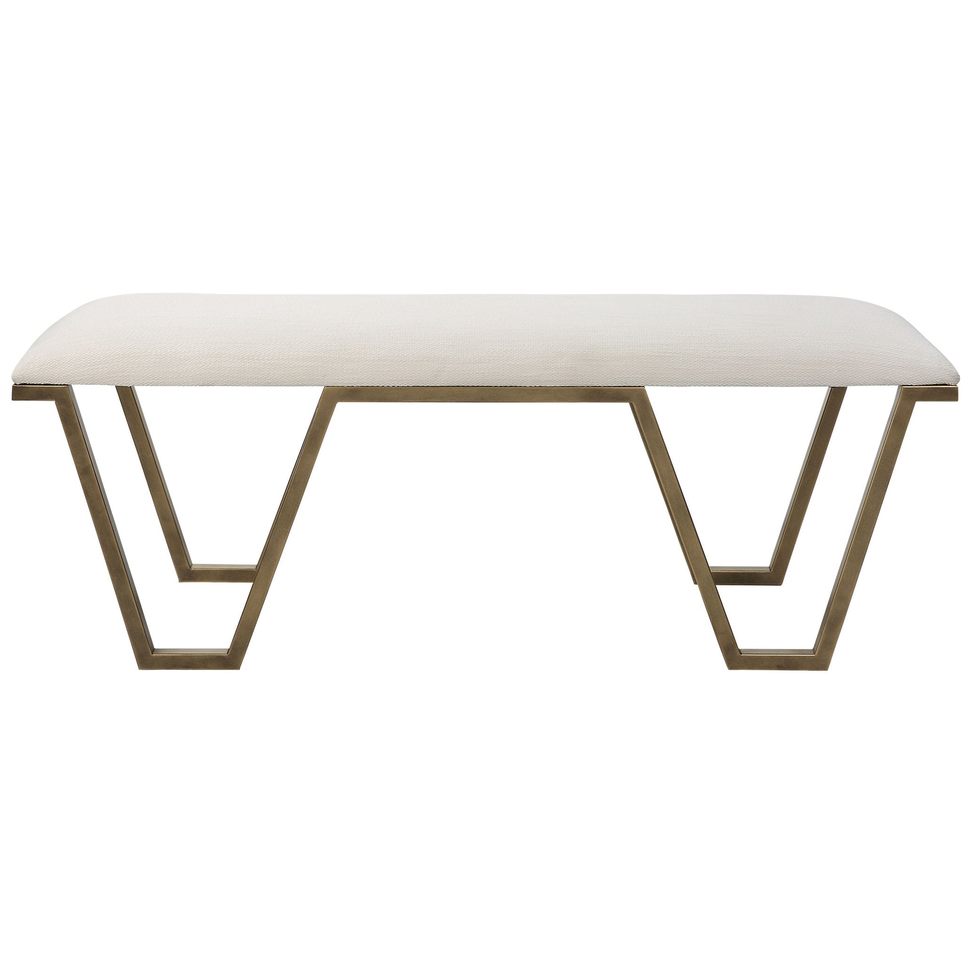 Classic And Sophisticated, This Accent Bench Features A Geometric Iron Base In Antique Gold Leaf With An Upholstered Seat In A Crisp White Textured Fabric.