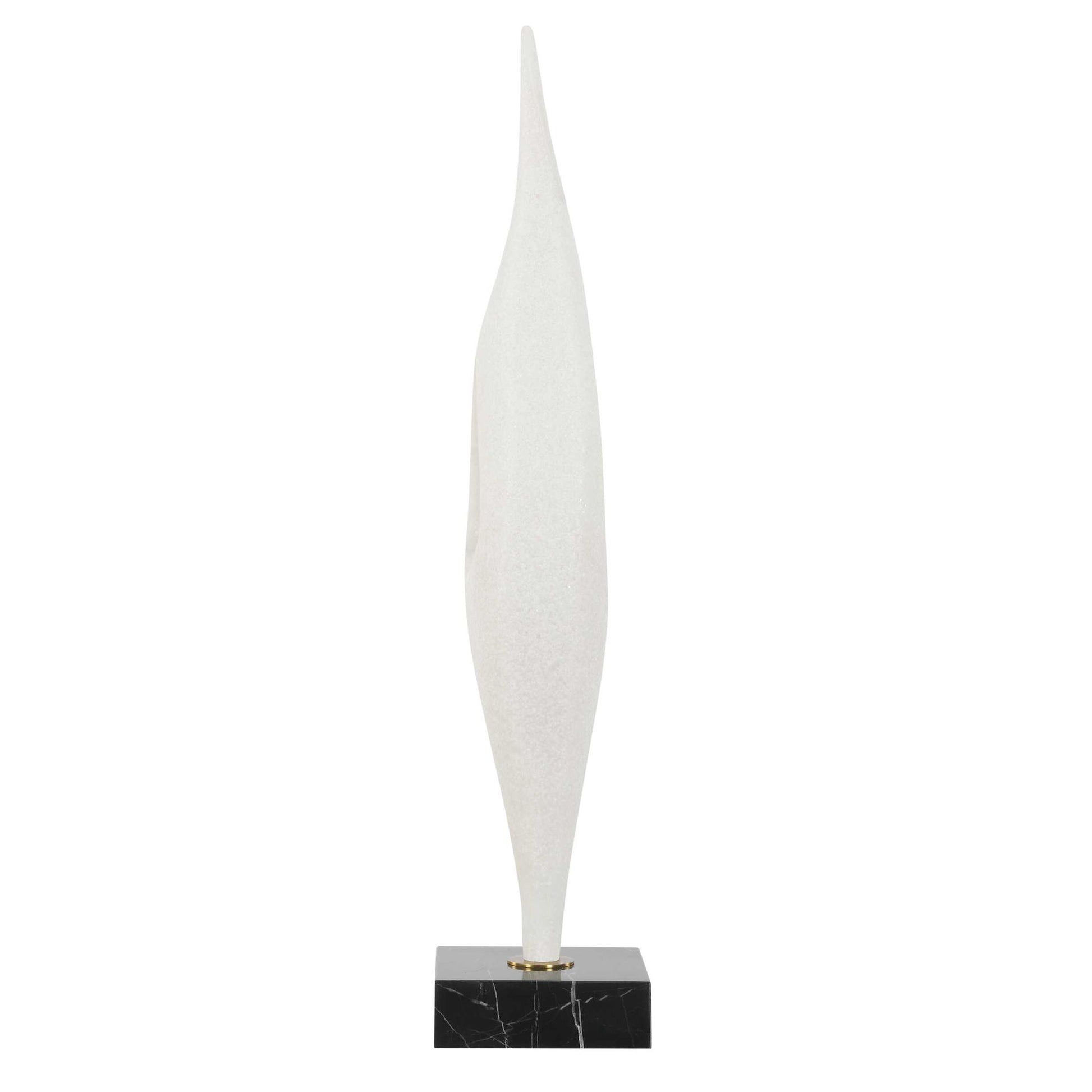 Crafted In A Matte White Man-made Stone That Accurately Replicating The Look Of Thassos Marble, This Elegant Sculpture Features A Fluid, Modern Silhouette That Makes A Bold Statement. It Rests Gracefully Atop A Black Marble Base With Subtle White Veining, Accented With A Delicate Antique Brass Plated Iron Detail.