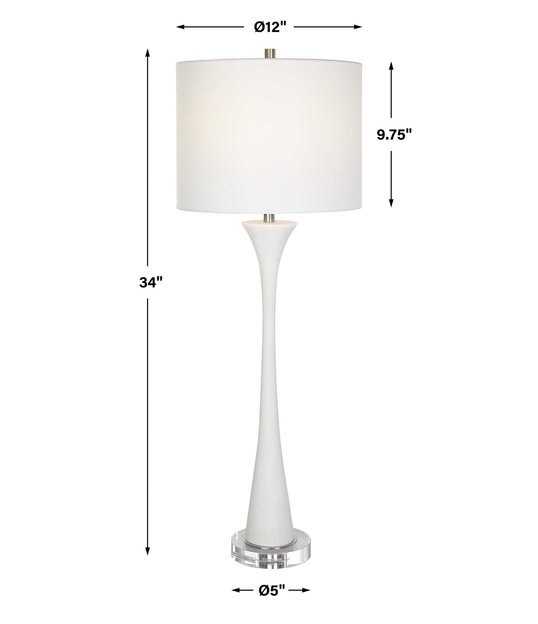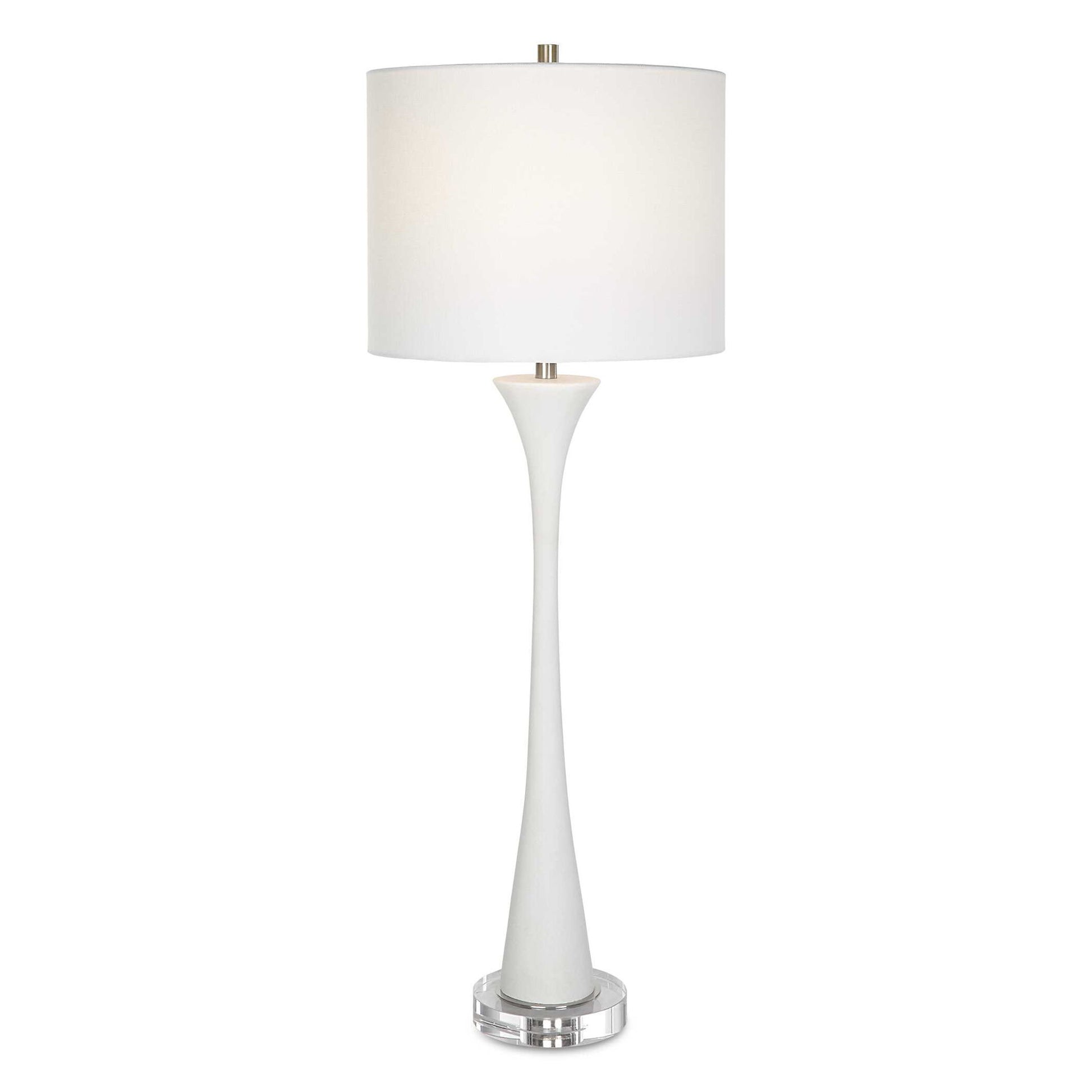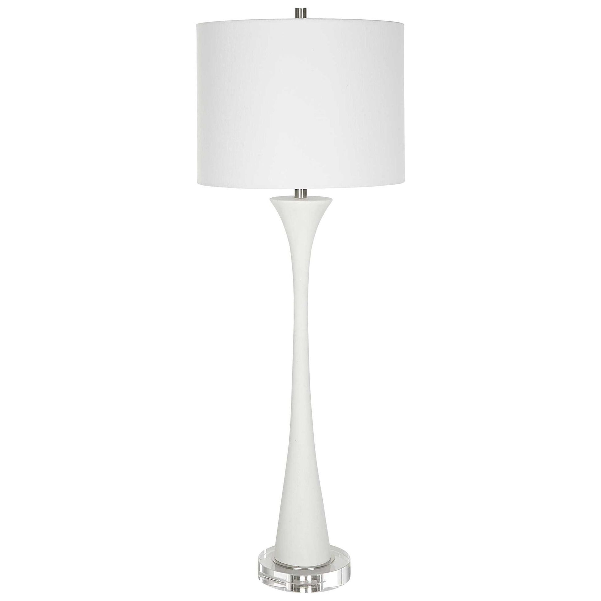 Showcasing A Classic Trumpet Shape, This Buffet Lamp Is Handcrafted From Ivory Man-made Stone That Accurately Replicates The Look Of Thassos Marble, Displayed On A Thick Crystal Foot, Paired With Brushed Nickel Plated Accents. A White Fabric Shade Completes The Piece.