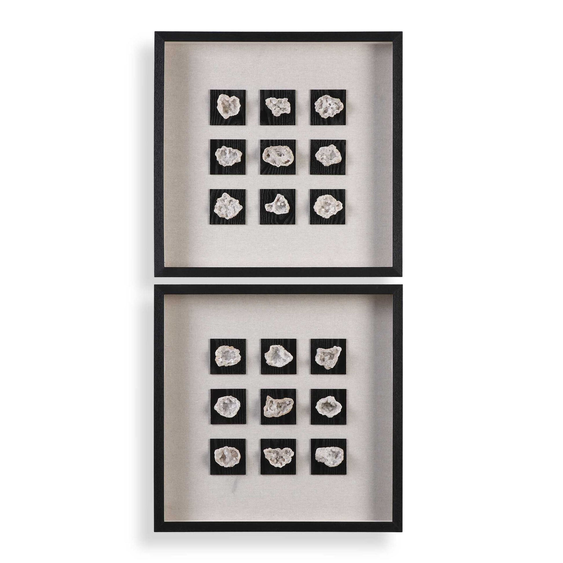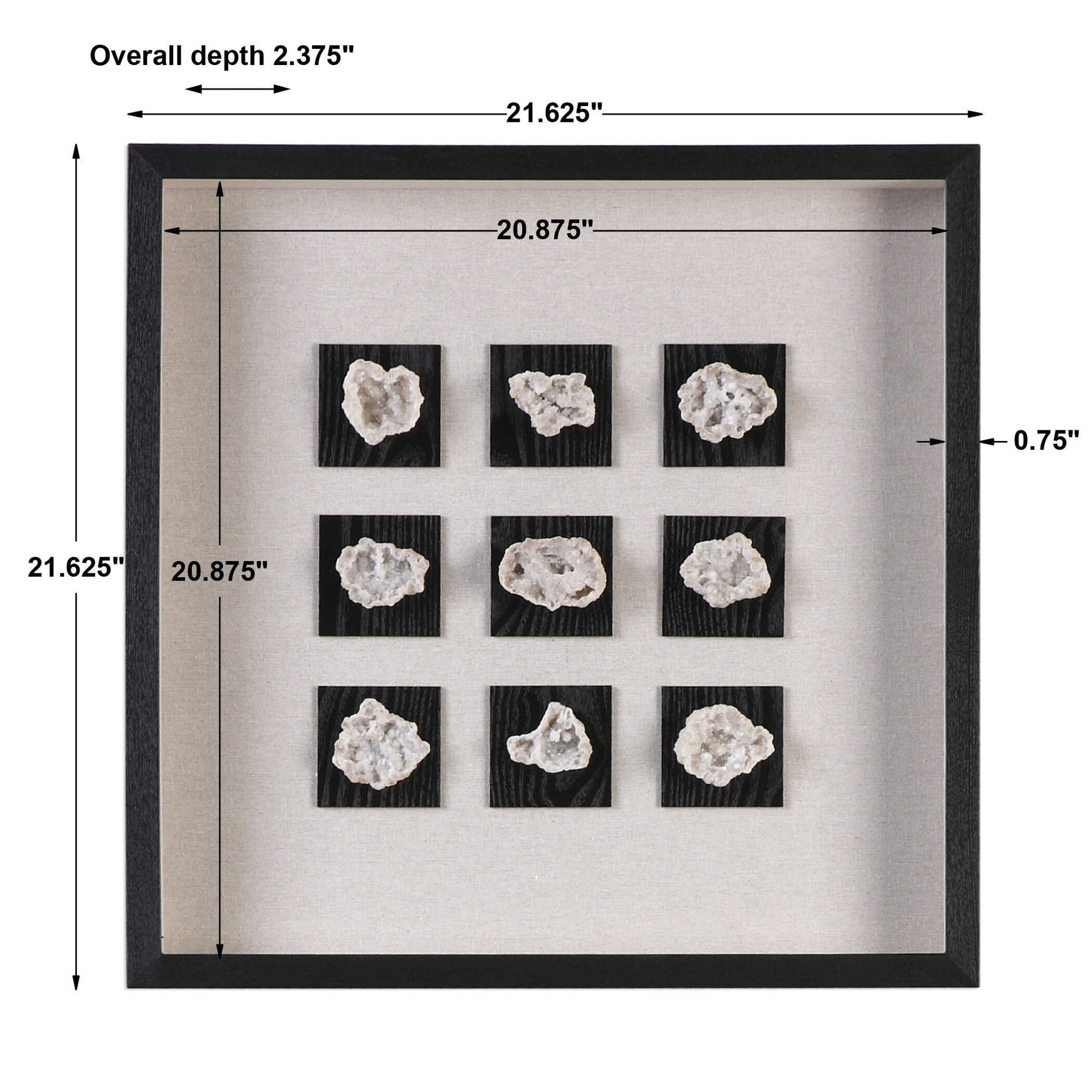 Authentic Geodes In Natural Hues Are Displayed On Black Woodgrain Matting Atop A Natural Linen Mat. A Black, Fir Wood Shadow Box Frame Completes The Display. Sizes And Shapes Of Geodes May Vary Slightly.