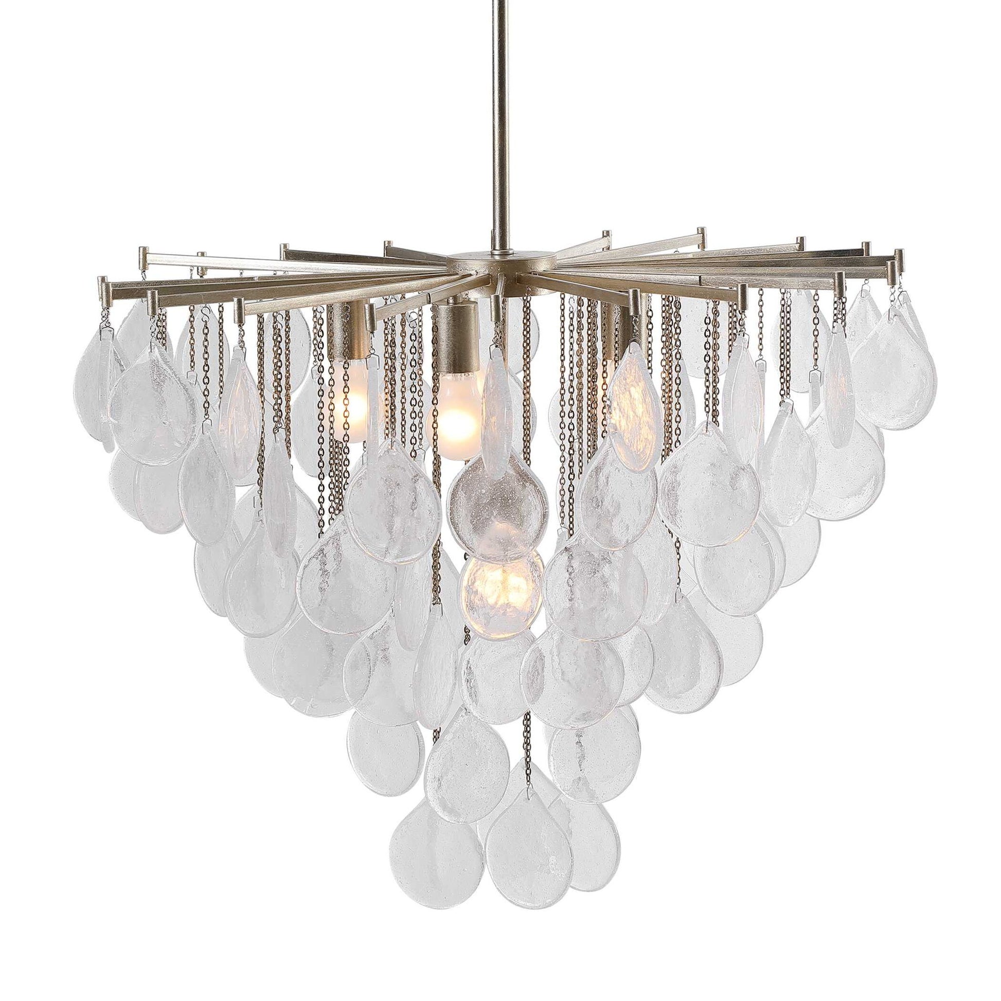 A Classic Shape With Sumptuous Tear Drop Seeded Glass Suspended On Fine Chains Refracting Light Beautifully. Transcending Traditional Design To Blend In With Even More Contemporary Interiors And Finished In A Rich Antique Bright Leaf. With 6-60 Watt Max, Edison Sockets And Includes 15' Wire, 3-12" Stems And 1-6" Stem For Adjustable Installation.