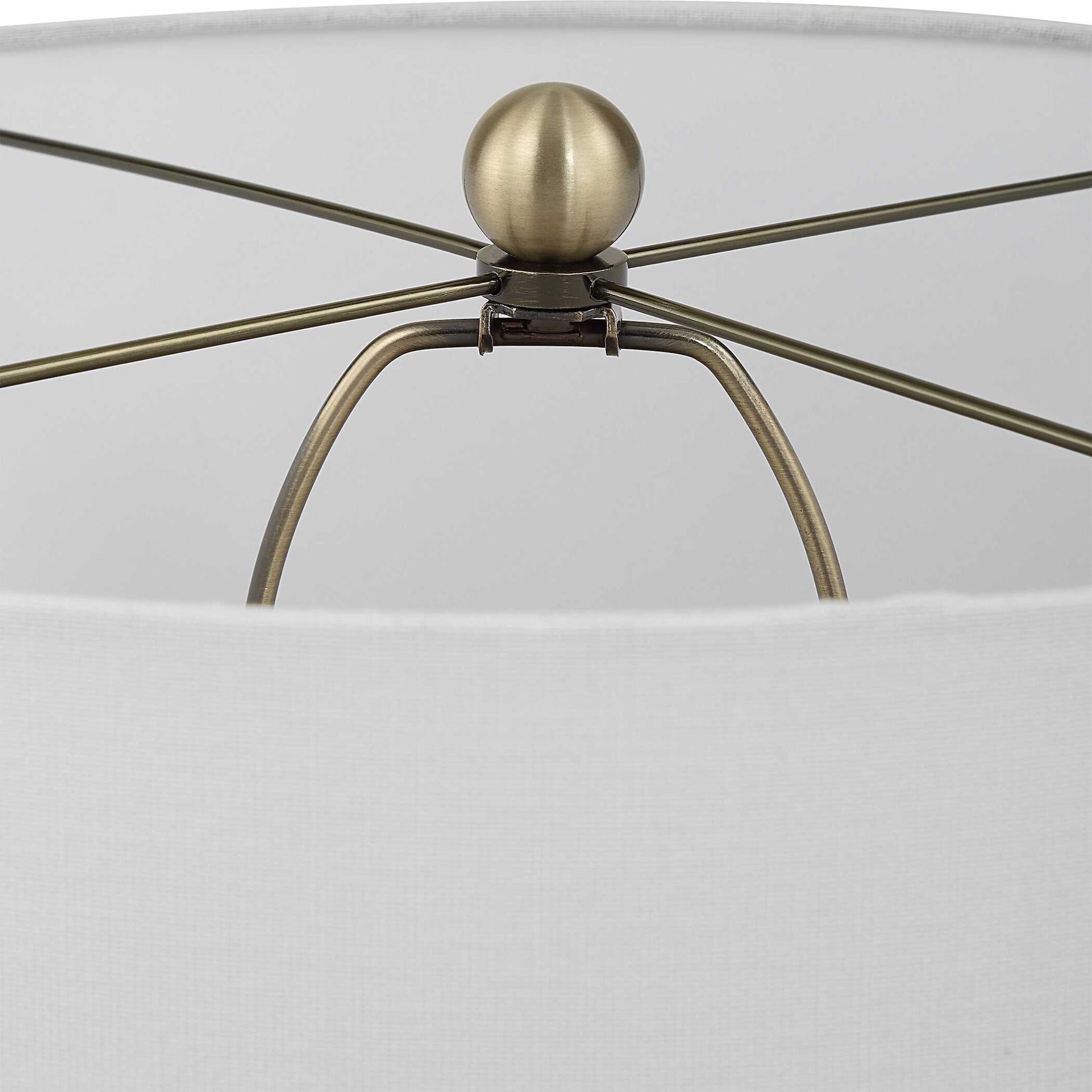 The Graphite Table Lamp Features A Large Ceramic Base In A Distressed Charcoal Finish With Intricate Ribbed Detailing And Antique Brass Plated Hardware. The Round Hardback Drum Shade Is Made In A Casual White Linen Fabric.