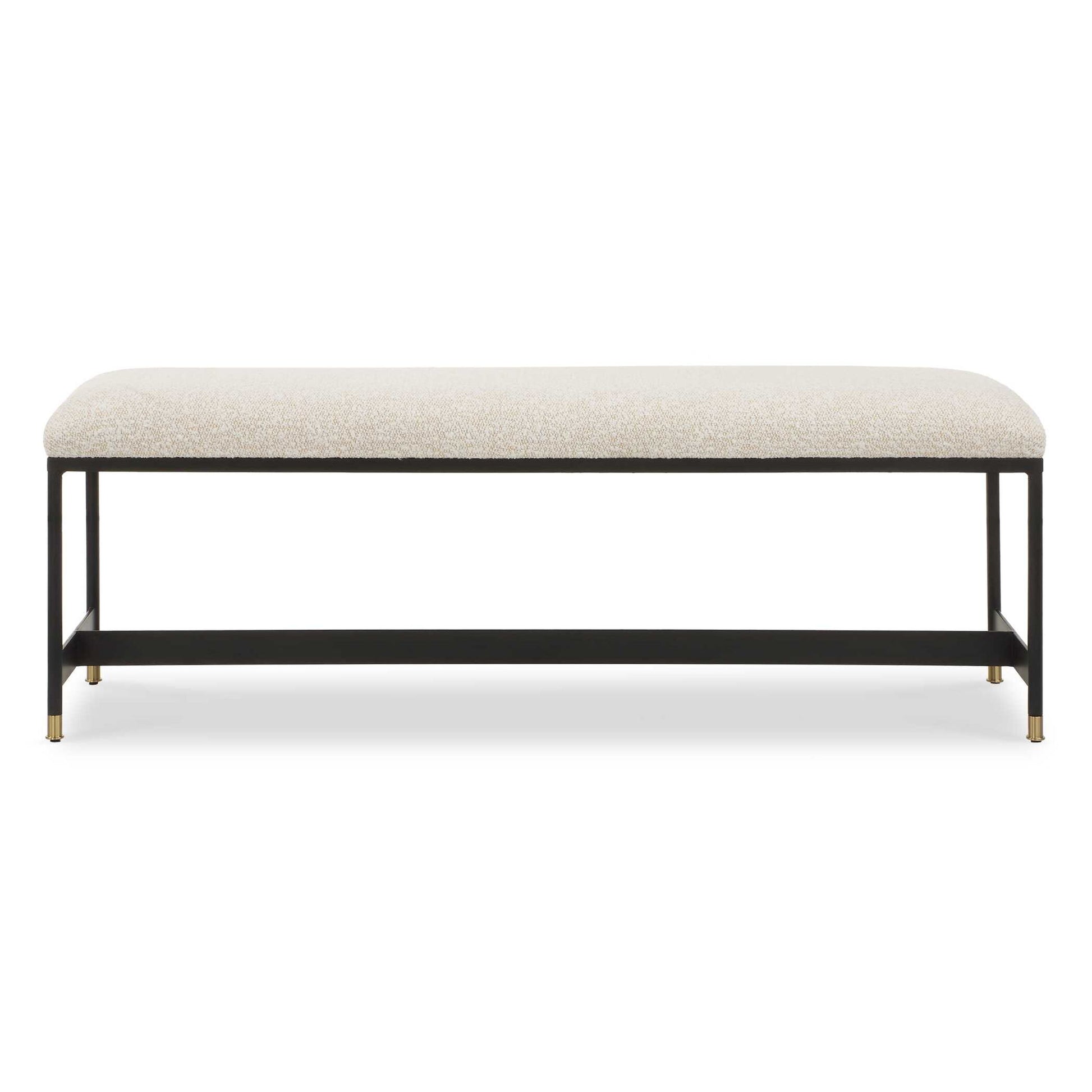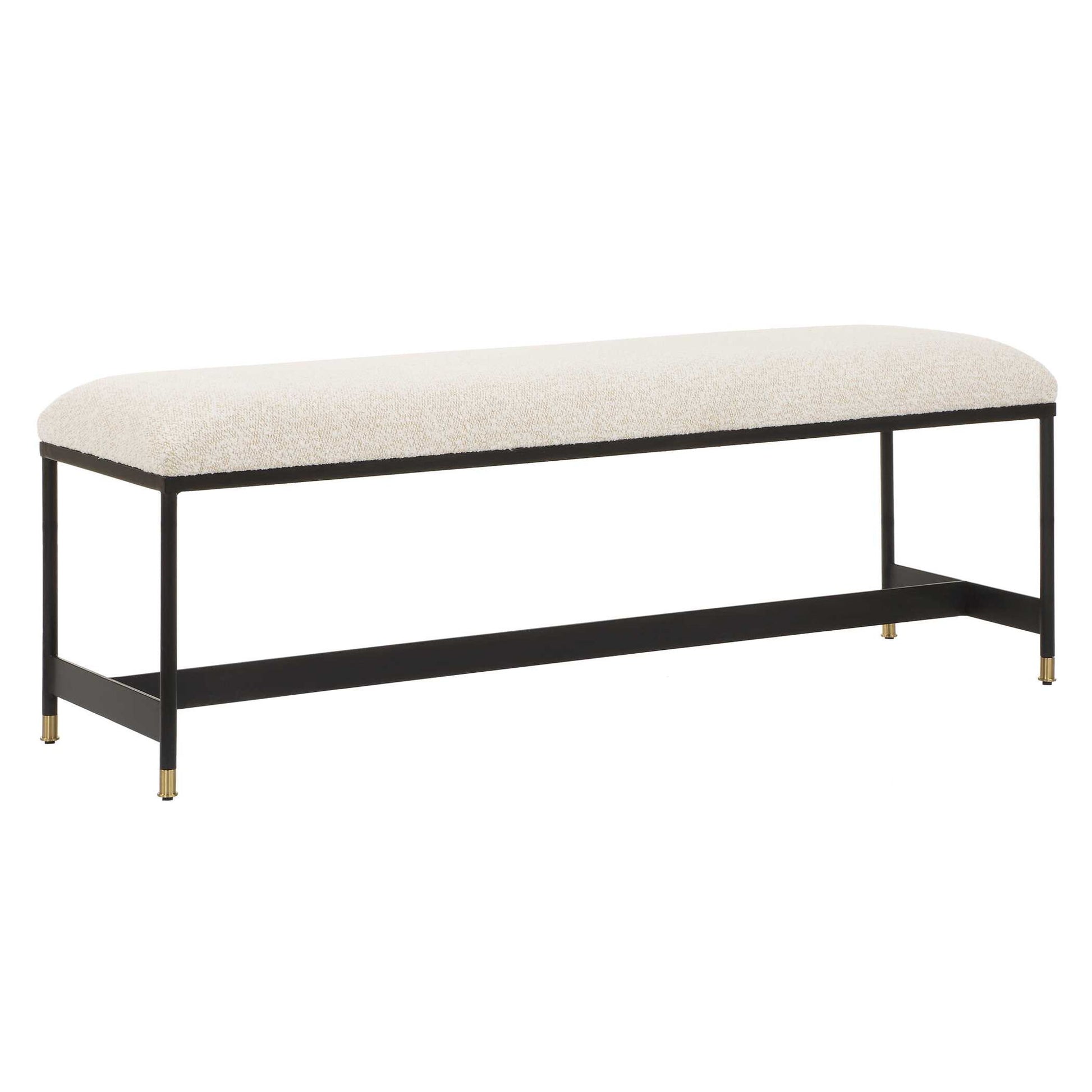 This Bench Features A Sleek Matte Black Iron Frame And Is Paired With A Plush Upholstered Seat In A Casual Off-white Polyester Blend With Wool-like Texture, Accented With Petite Brushed Brass Feet Caps.