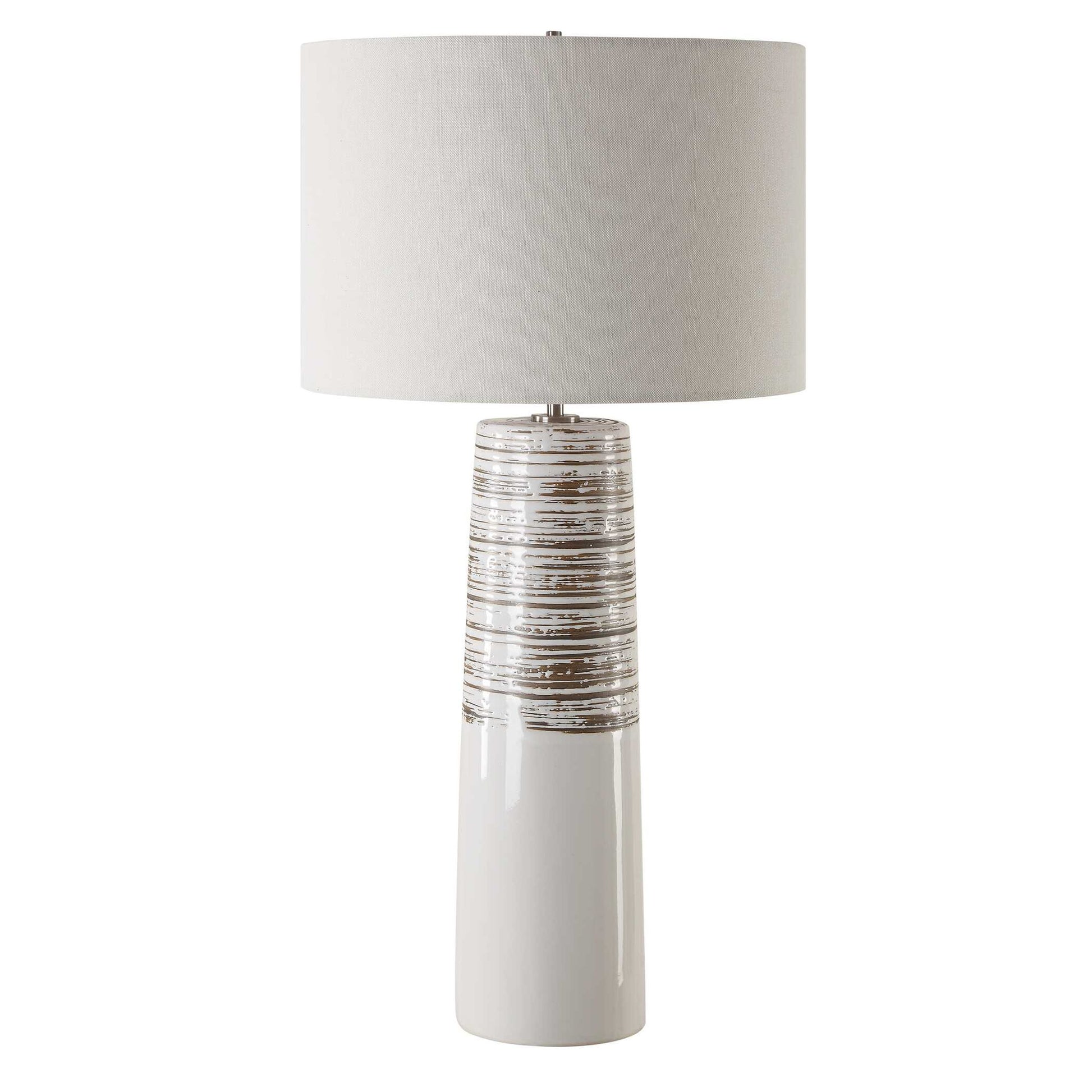 The Haven Table Lamp Combines Elegance With A Touch Of Rustic Charm. This Piece Features A Sleek Ceramic Base Cloaked In A Smooth White Glaze, Adorned With Subtly Ribbed, Distressed Accents, All Complemented By Brushed Plated Nickel Hardware For A Refined Finish. The Round Hardback Drum Shade Is Made In A Casual White Linen Fabric.