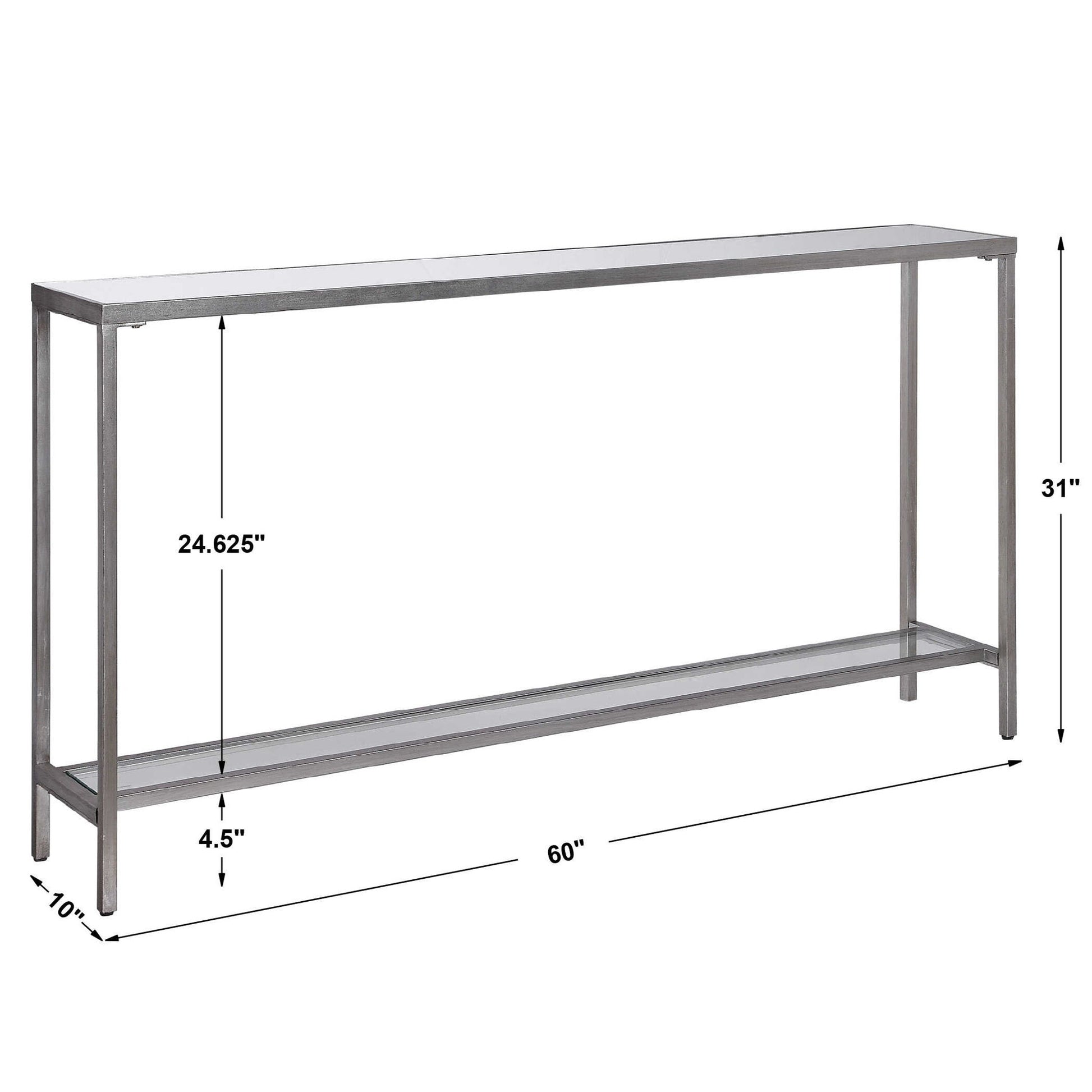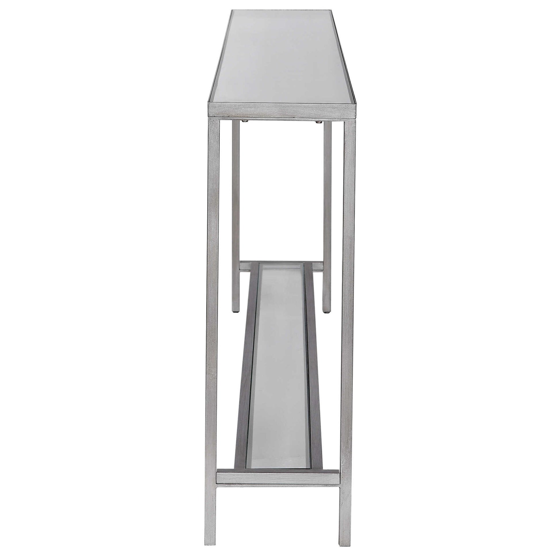 Classic And Minimalistic, This Narrow Iron Console Table Is Finished With Lightly Antiqued Silver Leaf, Inset With A Beveled Mirrored Top, And Gallery Shelf In Clear Glass.