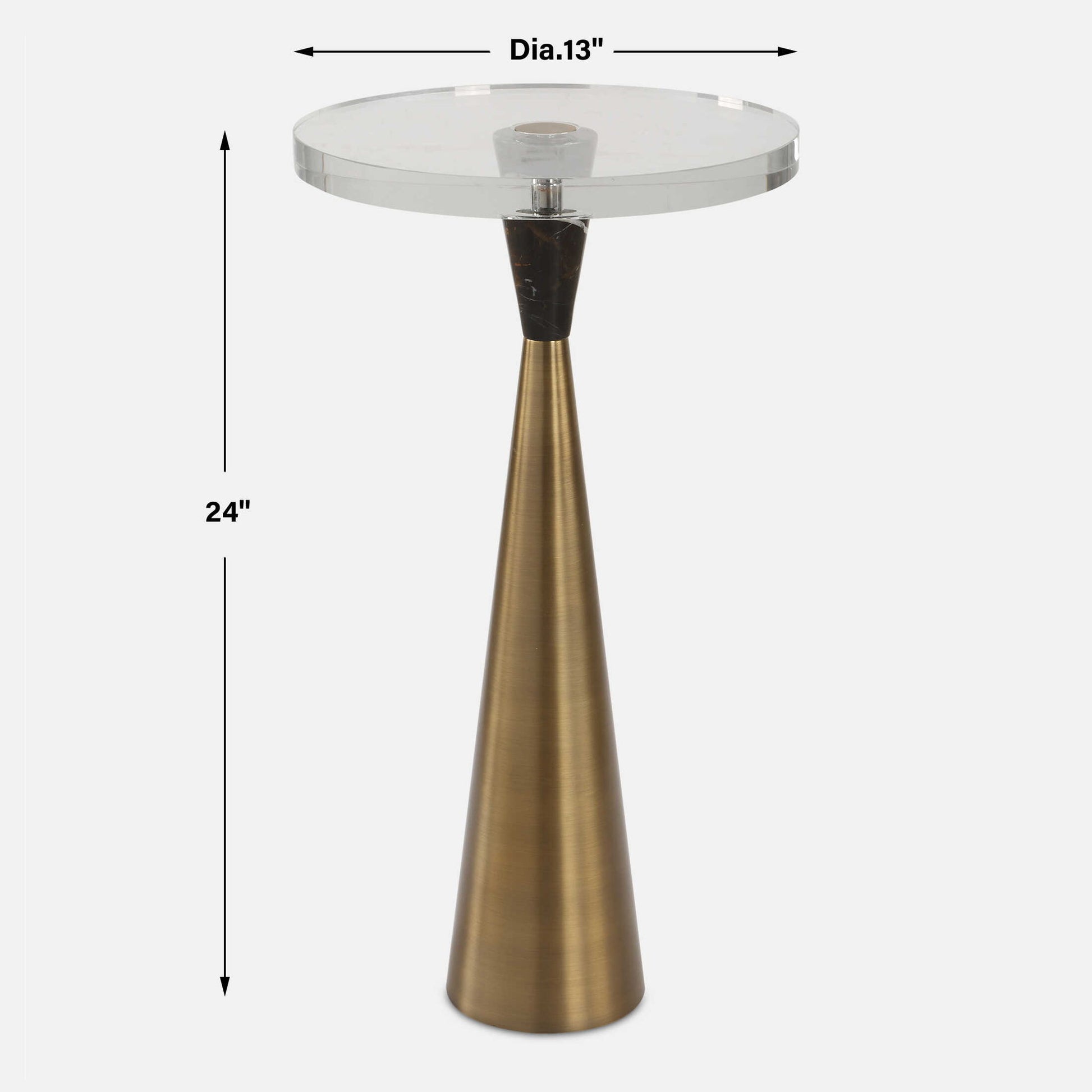 - Sleek And Contemporary, This Accent Table Showcases A Crystal Top Paired With A Tapered Metal Base In Brushed Brass, Beautifully Accented By Dark Marble Featuring Rich Chocolate And Warm White Veining.