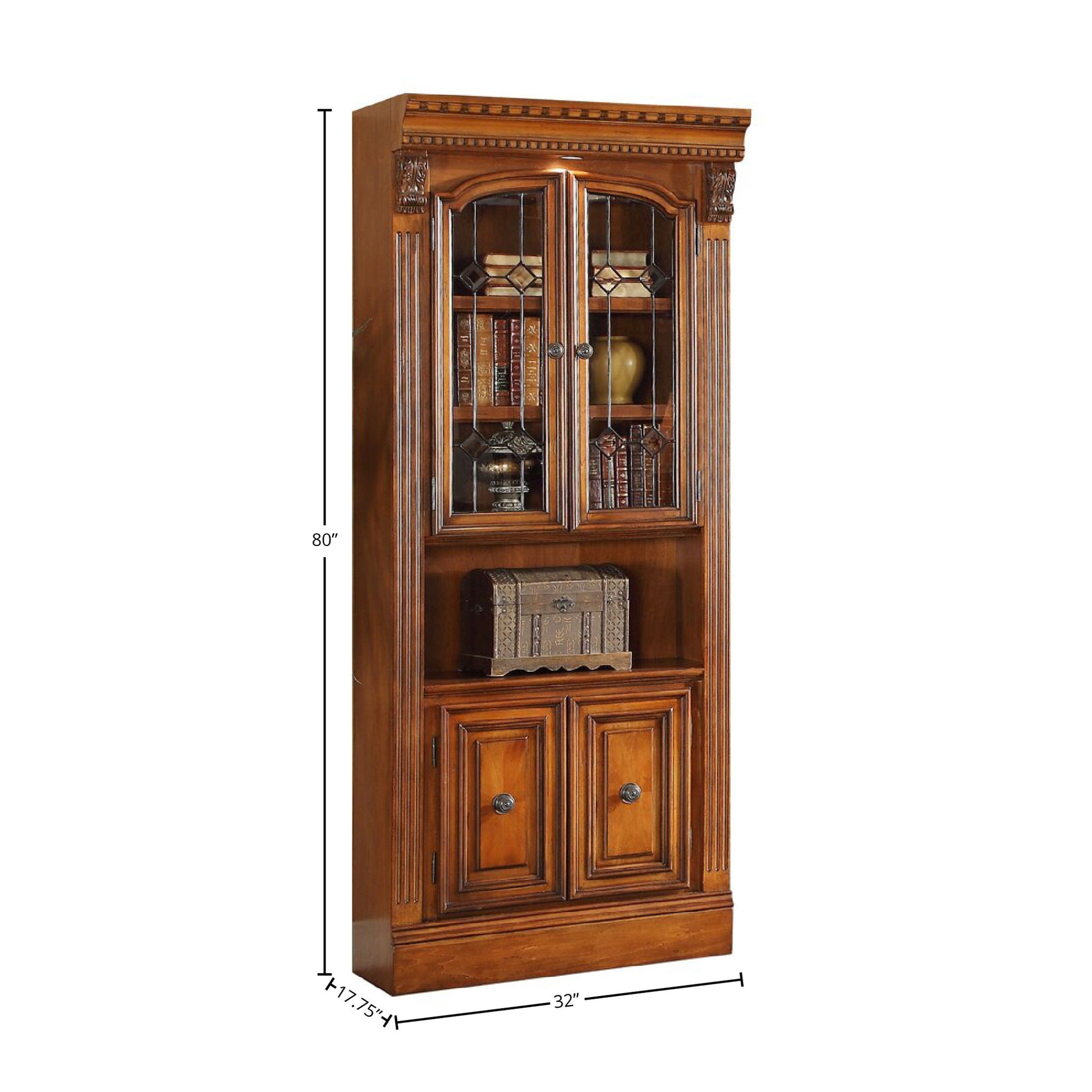 Design a stunning focal point with the Huntington library wall and this 32-inch Glass Door Bookcase. Ideal for displaying books, accessories and favorite treasures, it features open display shelves, glass doors and closed storage compartments. A rich Antique Vintage Pecan finish highlights its fluted columns and carved detailing.