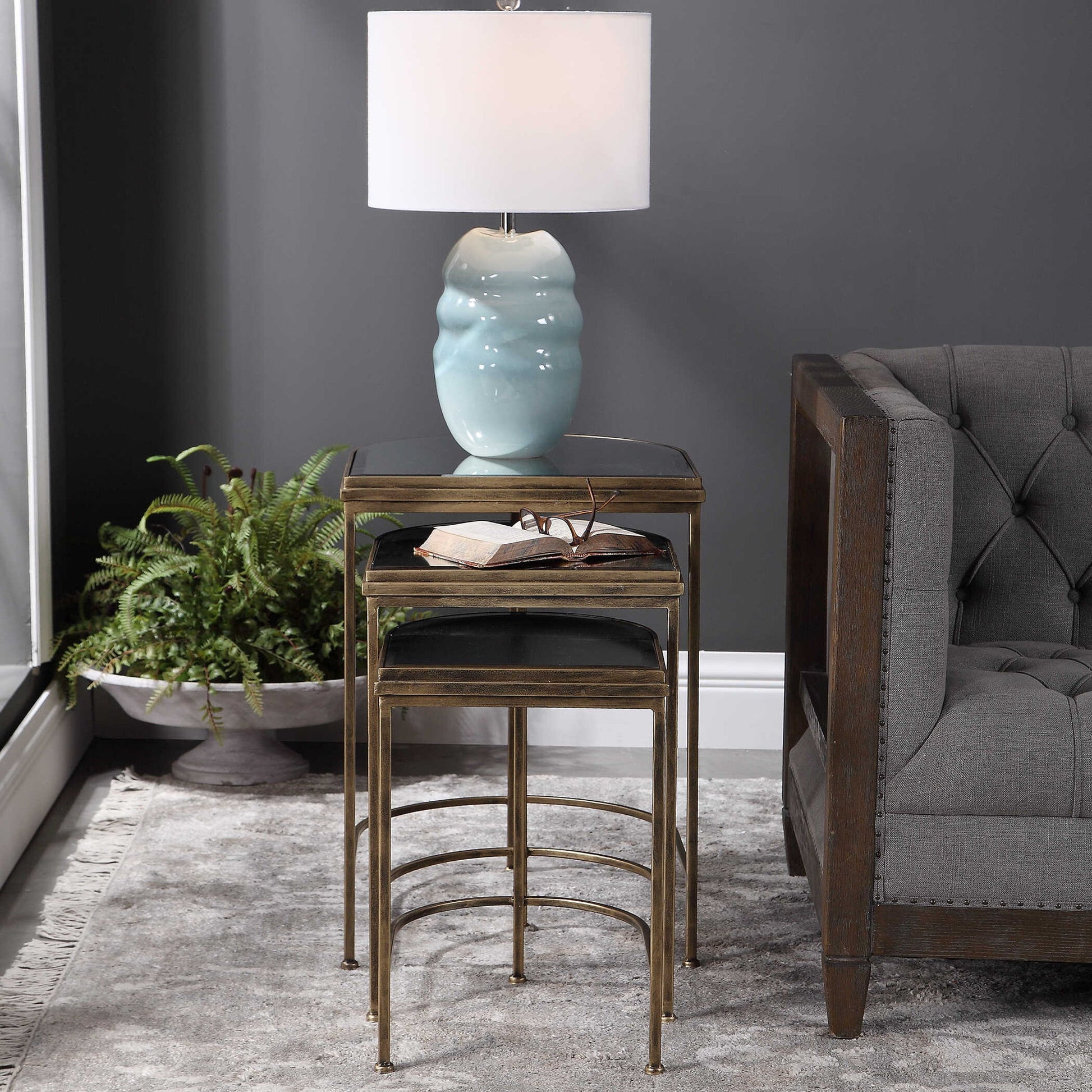 Set Of Three Nesting Tables With An Elegantly Curved Hand Forged Iron Frame, Finished In Antique Brushed Gold With Beveled Mirror Tops. Sizes: Sm-13x13x18, Med-15x16x21, Lg-18x19x24