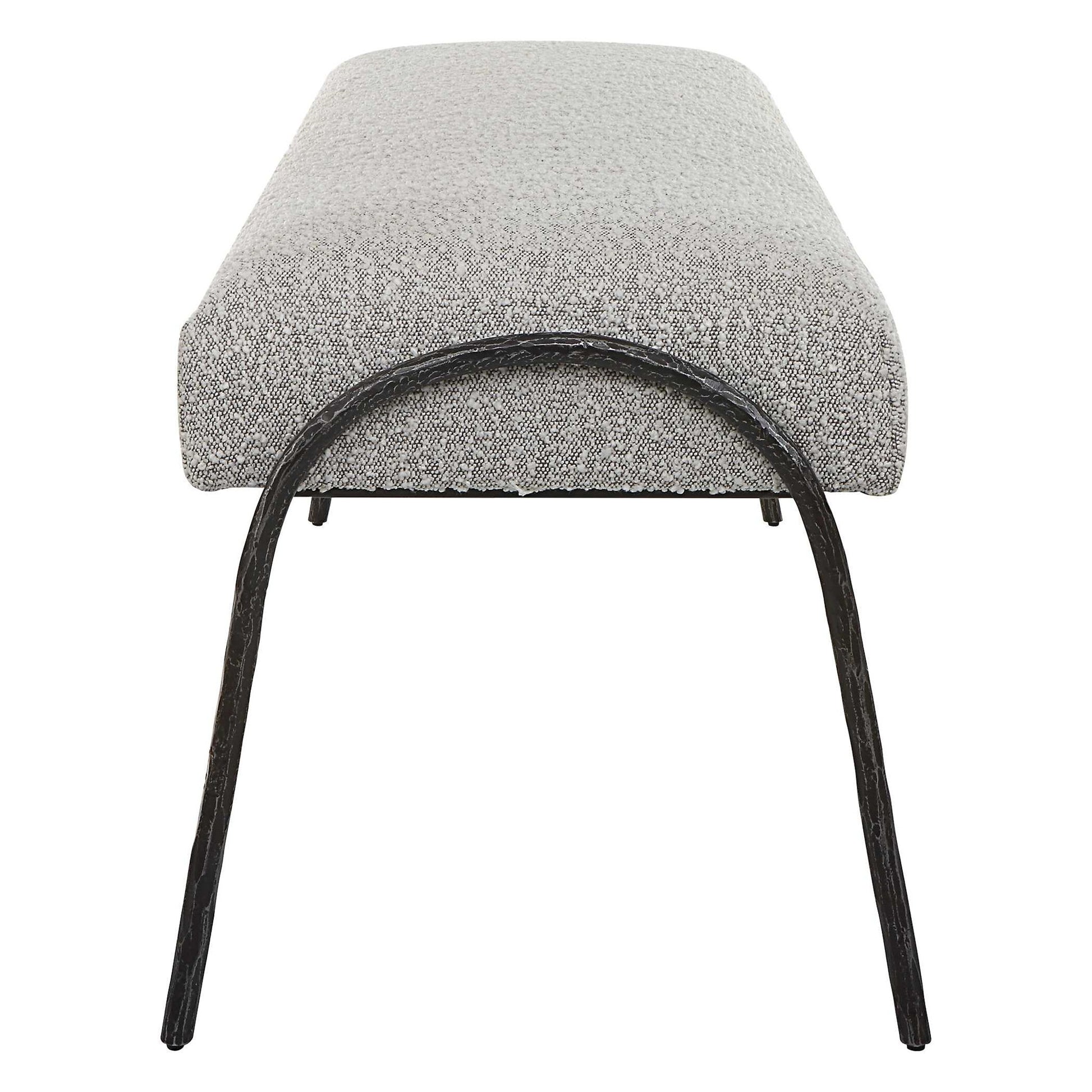 Inspired By Scandinavian Designs, This Bench Showcases Elegant Curved Lines With A Chiseled Iron Frame In A Natural Aged Black Iron Finish. A Casual Ivory And Warm Gray Textured Boucle Fabric Accents This Modern Look.