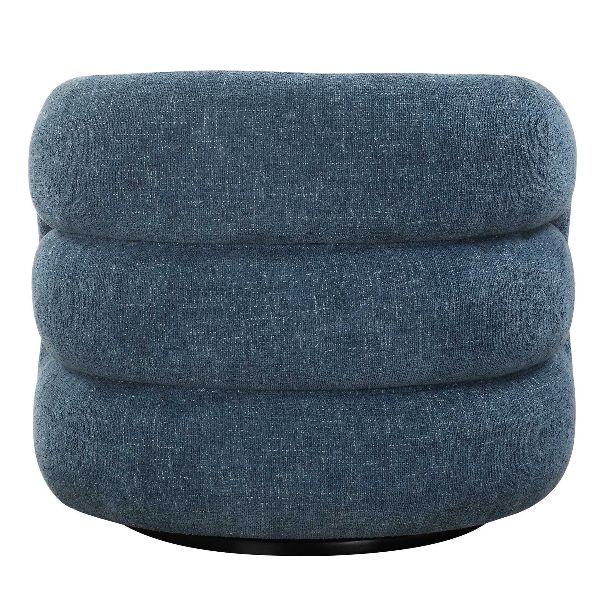 Elevate Your Living Space With This Barrel Style Swivel Chair, With A Dramatic Channeled Back Covered In A Knubby Blueberry Chenille. Rests On A Matte Black Swivel Base.