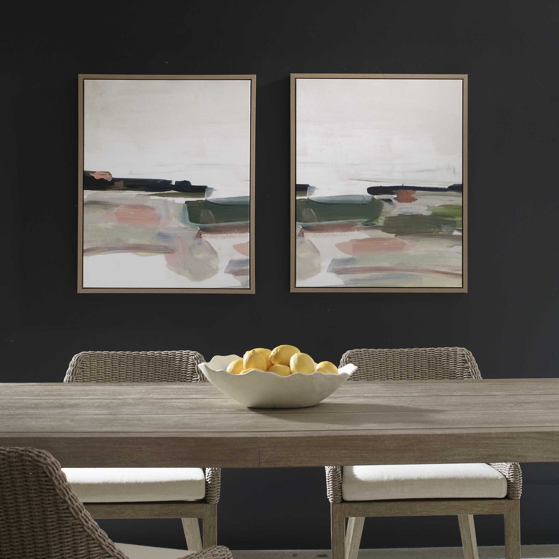 In This Set Of Abstract Landscapes, Soft Washes Of Salmon, Mauve, Green, And Cream Ground The Artwork While Allowing The Eye To Wander Through Its Beautiful, Blended Textures. A Gallery Frame With A Light Oak Finish Completes The Artwork. Each Canvas Is Proudly Handcrafted And Printed In The USA. Artwork By Daph Haus.