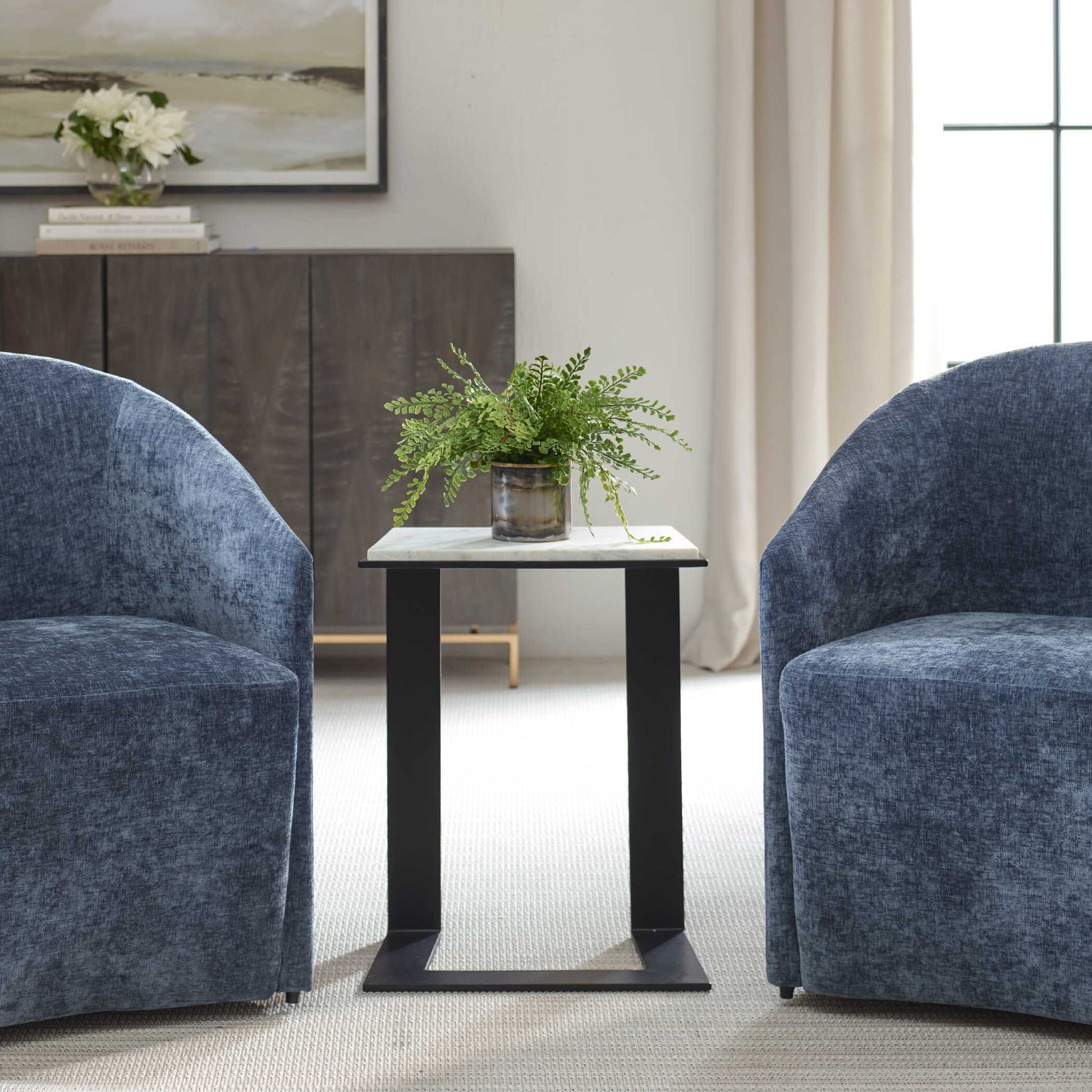 This Accent Table Boasts A Honed White Marble Top, Beautifully Framed In Black-plated Iron, Creating A Striking Contrast Of Materials. True To The Nature Of Natural Materials, Each Piece Will Have Unique Marbling And Veining Throughout.