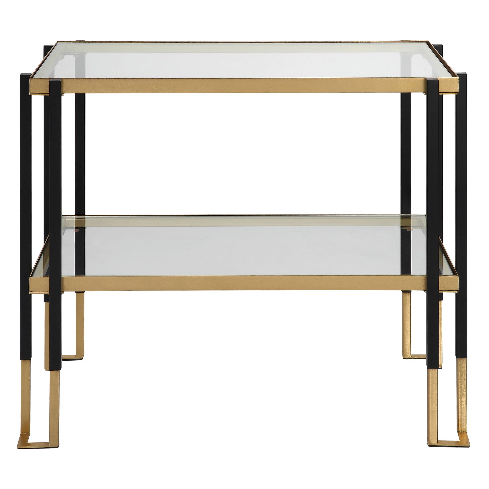 Featuring A Clean Lined Solid Iron Frame, This Contemporary Table Is Finished In A Two-toned Matte Black And Gold Leaf. Has Two Tempered Glass Shelves.