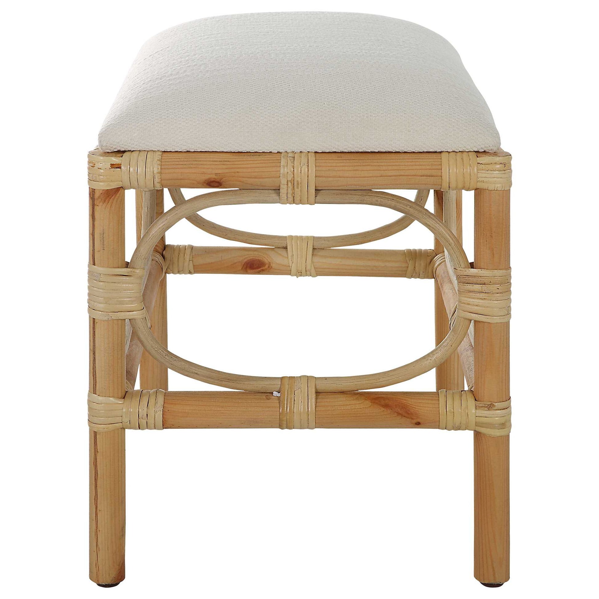A Refreshing Coastal Accent Featuring A Crisp White Textured Fabric, Over A Naturally Finished Solid Wood Base With Rattan Wrapped Accents. Perfect Doubled Up At The Foot Of A Bed Or Under A Console Table.