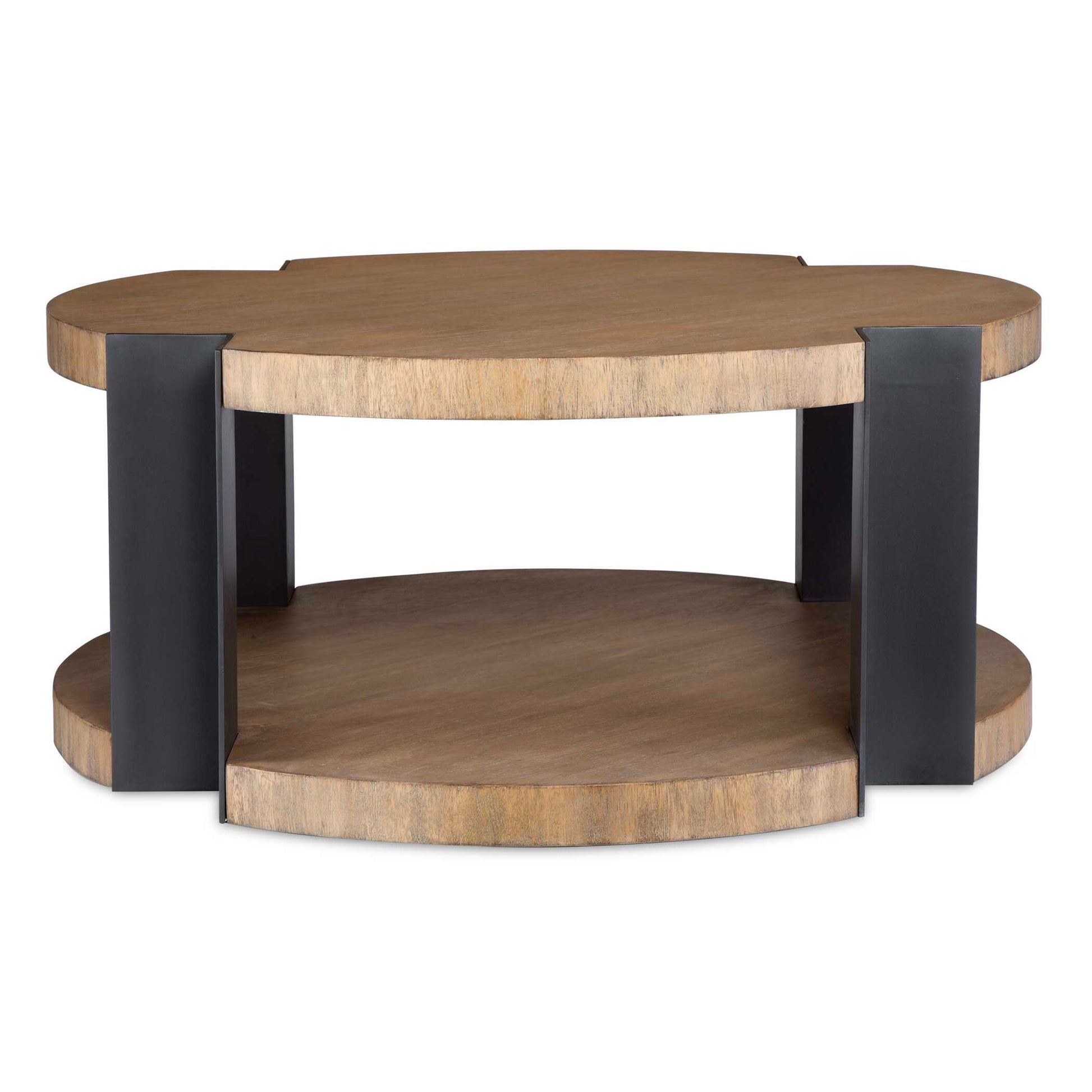 This Contemporary Coffee Table Harmonizes Natural Wood Elements With Industrial Style. Matte Black Metal Posts Accent The Circular Top And Lower Shelf, Both Crafted From Warm, Neutral Wood Tones, Creating A Bold Contrast That Will Be A Striking Piece In Any Space.