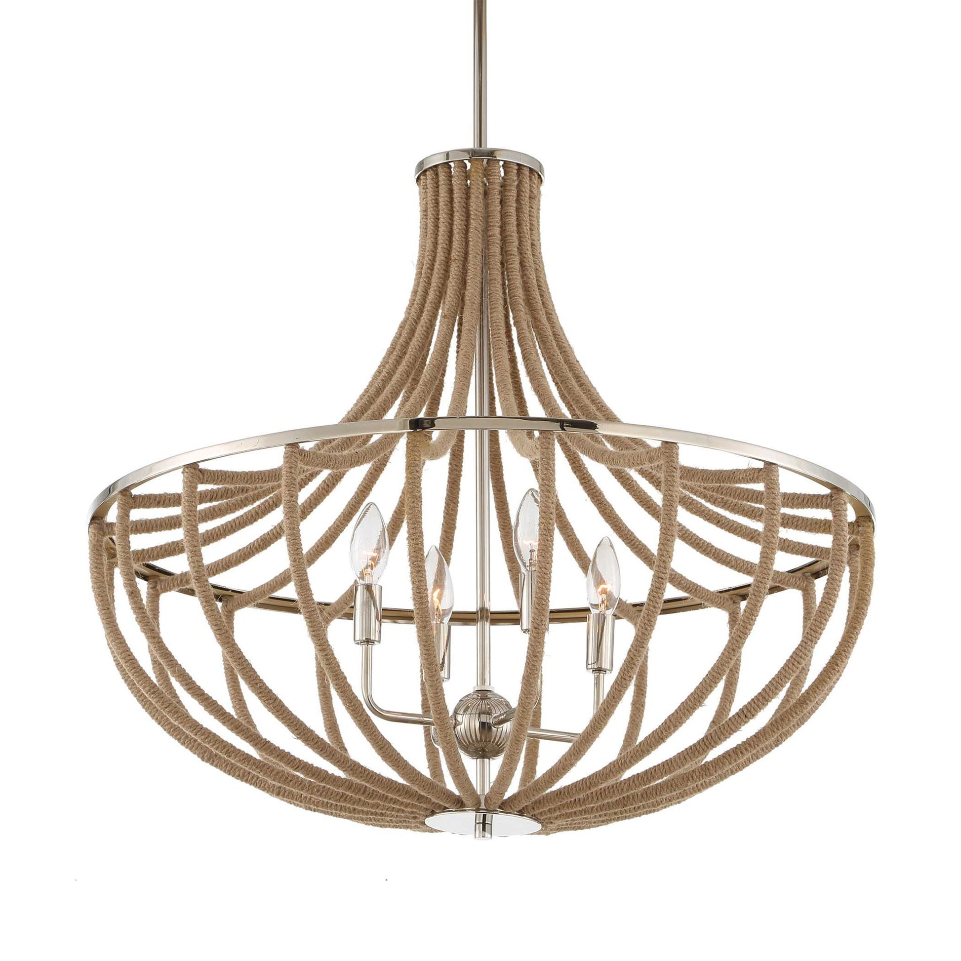 A Classic Empire Shaped Pendant In A Polished Nickel Finish With A Softening Effect From Natural Twisted Wrapped Rope Accenting The Frame Giving A Warm Casual Effect. 4-60 Watt Max Candelabra Sockets. Bulbs Not Included. Supplied With 15' Wire, 3-12" Stems And 1-6" Stem For Adjustable Installation.