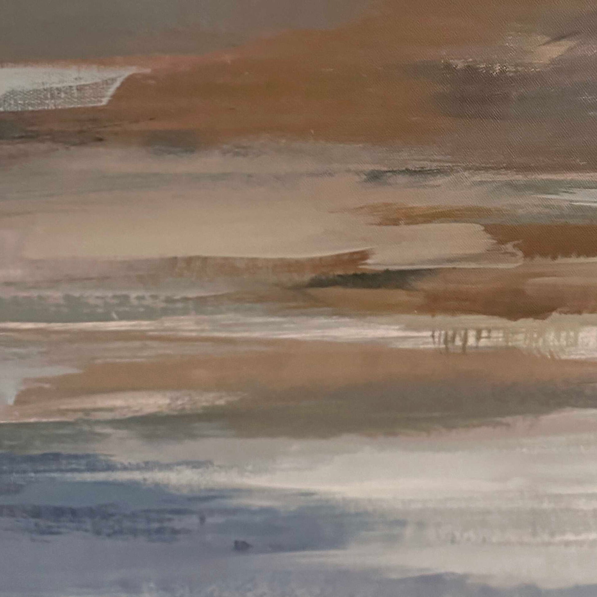 Lowlands Framed Canvas Displays An Abstract Landscape In A Palette Of Grays, Blues, And Warm Browns. A Double Gallery Frame, In White And Gray Washed Wood, Encases The Artwork. Each Canvas Is Proudly Handcrafted And Printed In The USA. Artwork By Liz Jardine.