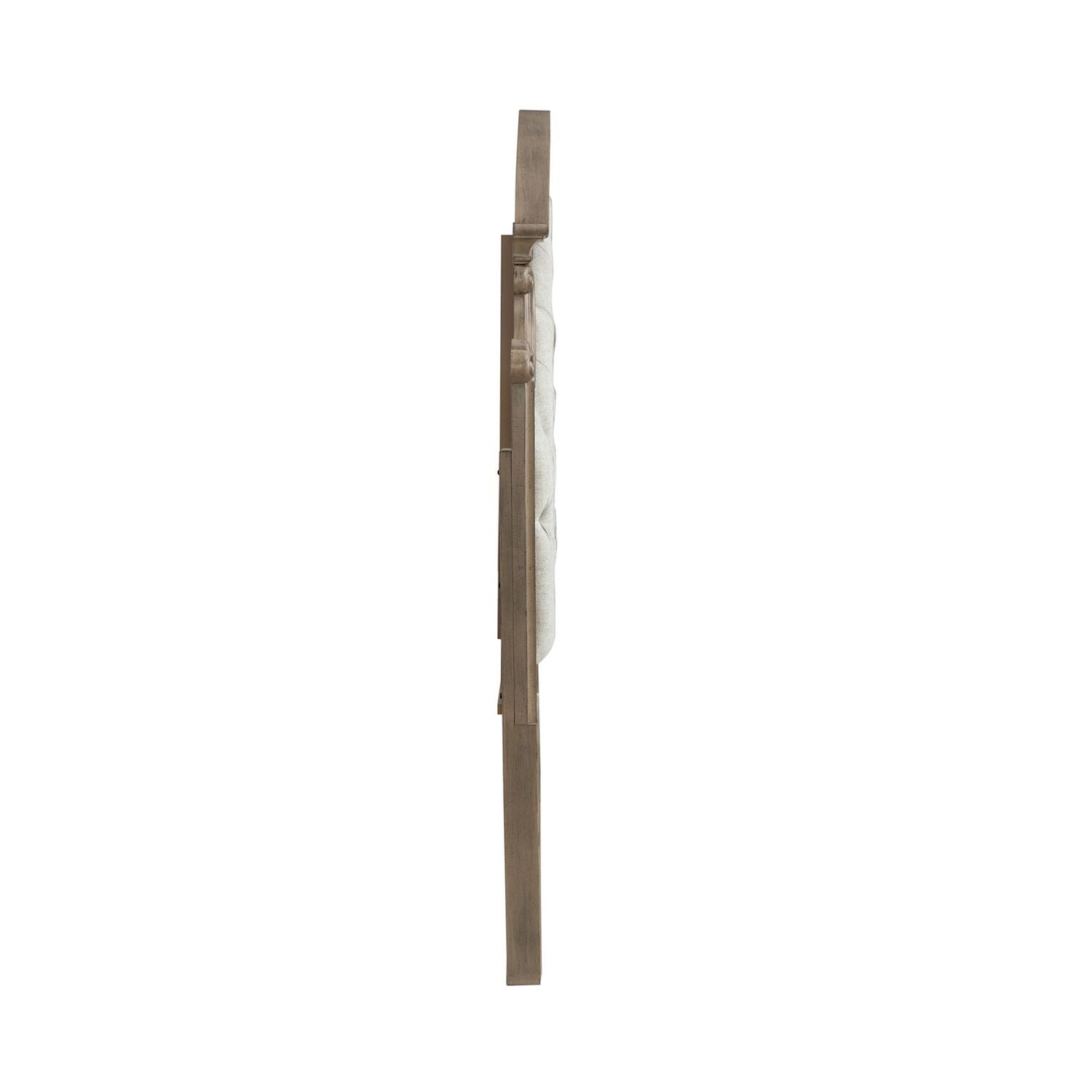 Accent your bedroom with the perfect blend of European Traditional design and casual appeal using the Magnolia Manor Upholstered Headboard. Finished in a weathered brown and antique white finish with heavy chipping combination this piece is crafted of poplar solids and white oak and birch veneers.The upholstered headboard is button tufted in a chenille fabric laced with tones of white, tan and brown threads and features an arched crown with dog bone accents on each corner adding definition and character. The headboard will work with a metal bed frame or the panel footboard and rails.