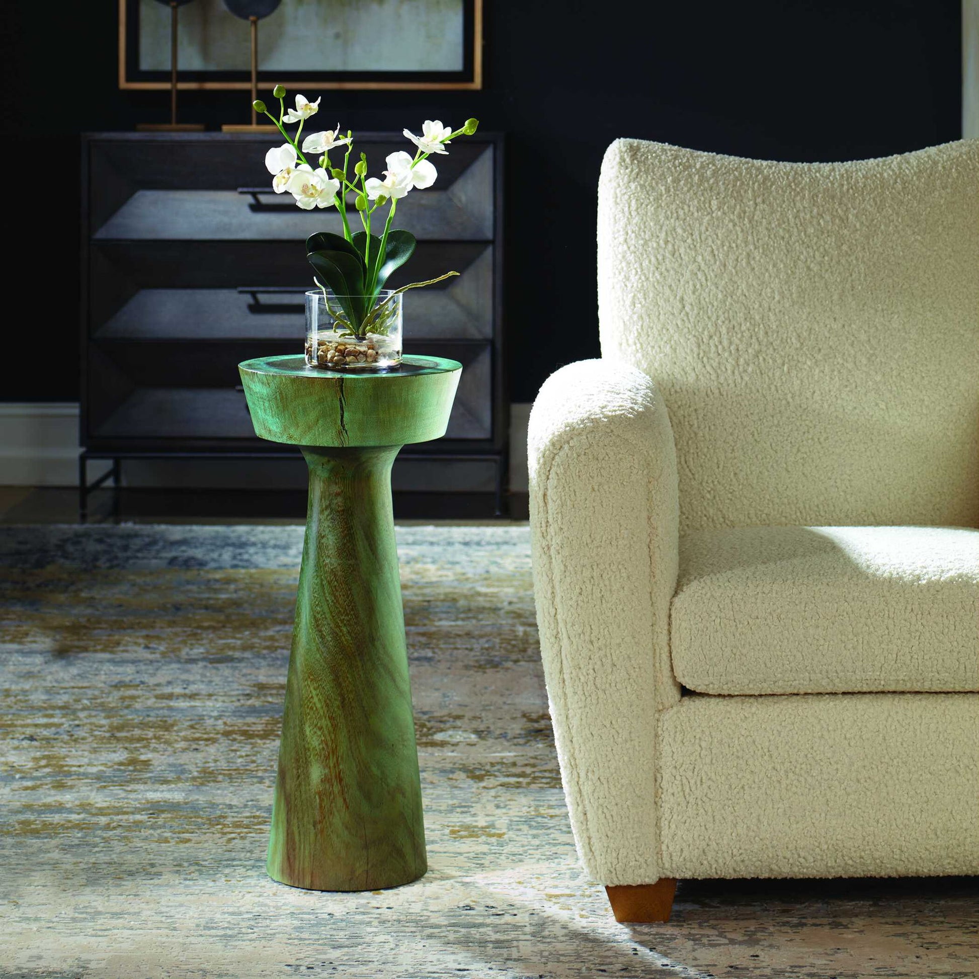Crafted From Solid Suar Wood, This Drink Table Features A Striking Blend Of Blue And Green Tones That Enhance Its Natural Grain And Organic Form. The Tabletop Sits Atop A Tapered Pedestal Base.