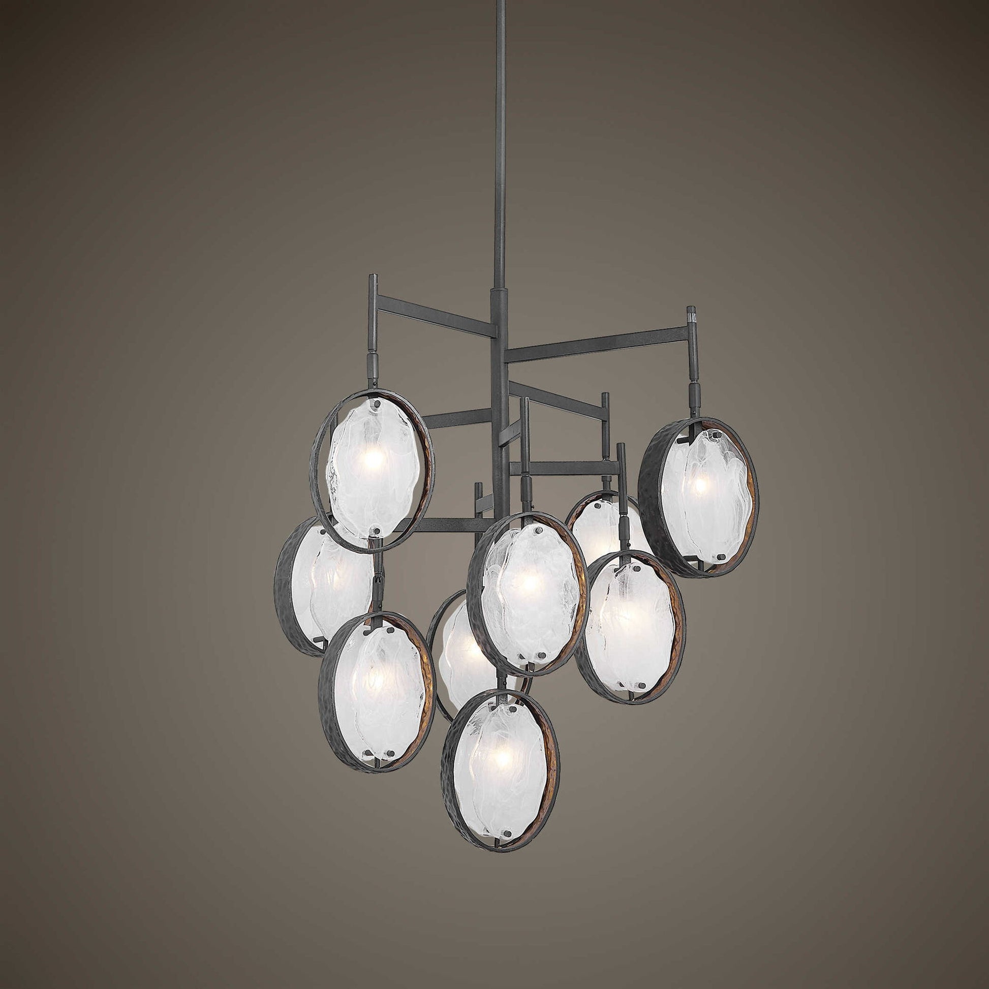 Rings Of Dark Hammered Bronze With A Subtle Golden Interior. Inspired From Mid-century Modern Design, Each Ring Holds Two Handmade Artisan Inspired Clear And White Swirl Glass Ovals. With 15-40 Watt Max, G9 Sockets And Includes 15-25 Watt Clear, G9 Bulbs. Supplied With 15' Wire, 3-12" Stems And 1-6" Stem For Adjustable Installation.