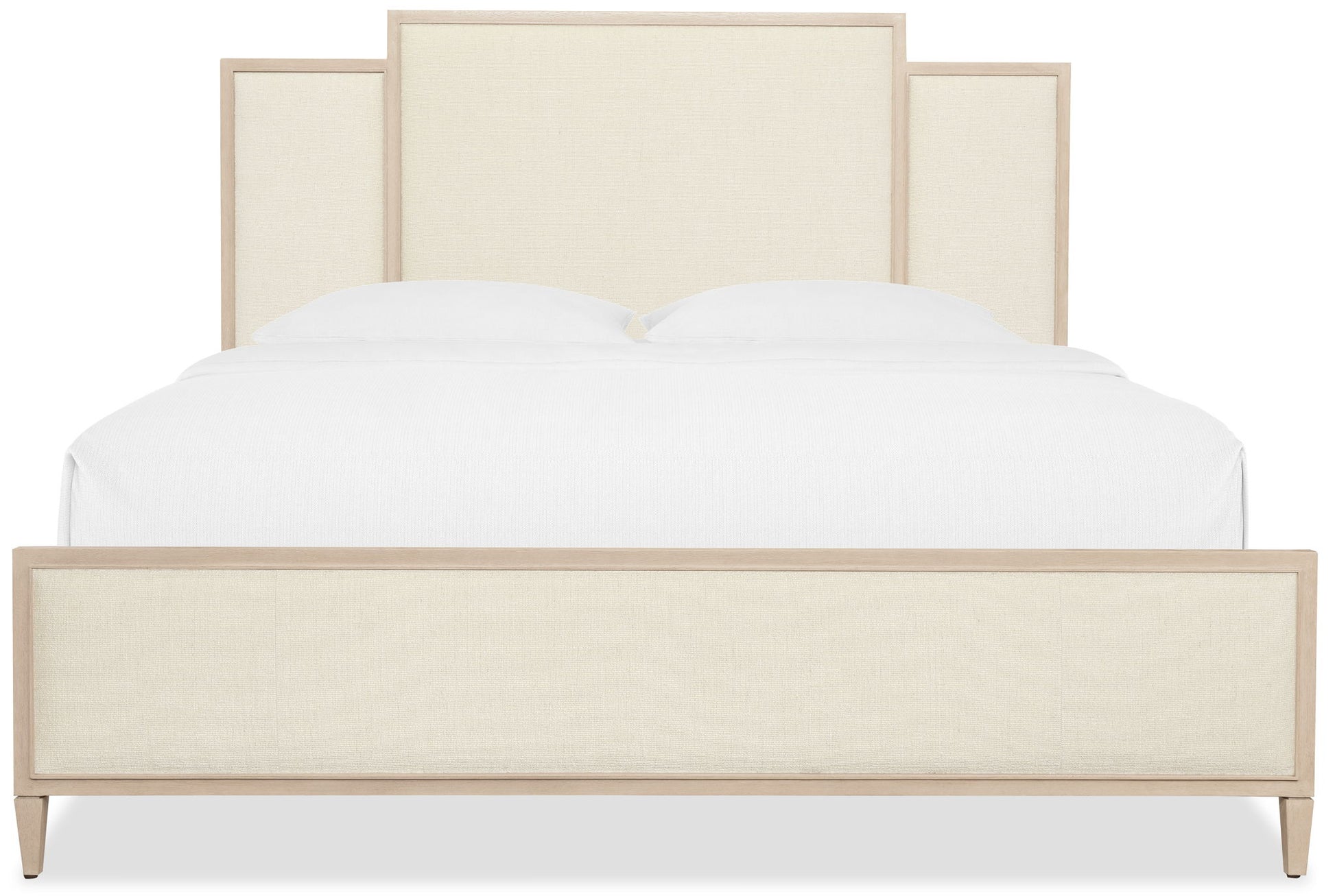 Make a grand statement with this panel bed, designed with graceful tiers of soft fabric and a polished limestone oak veneer frame. Ideal for spacious primary suites.