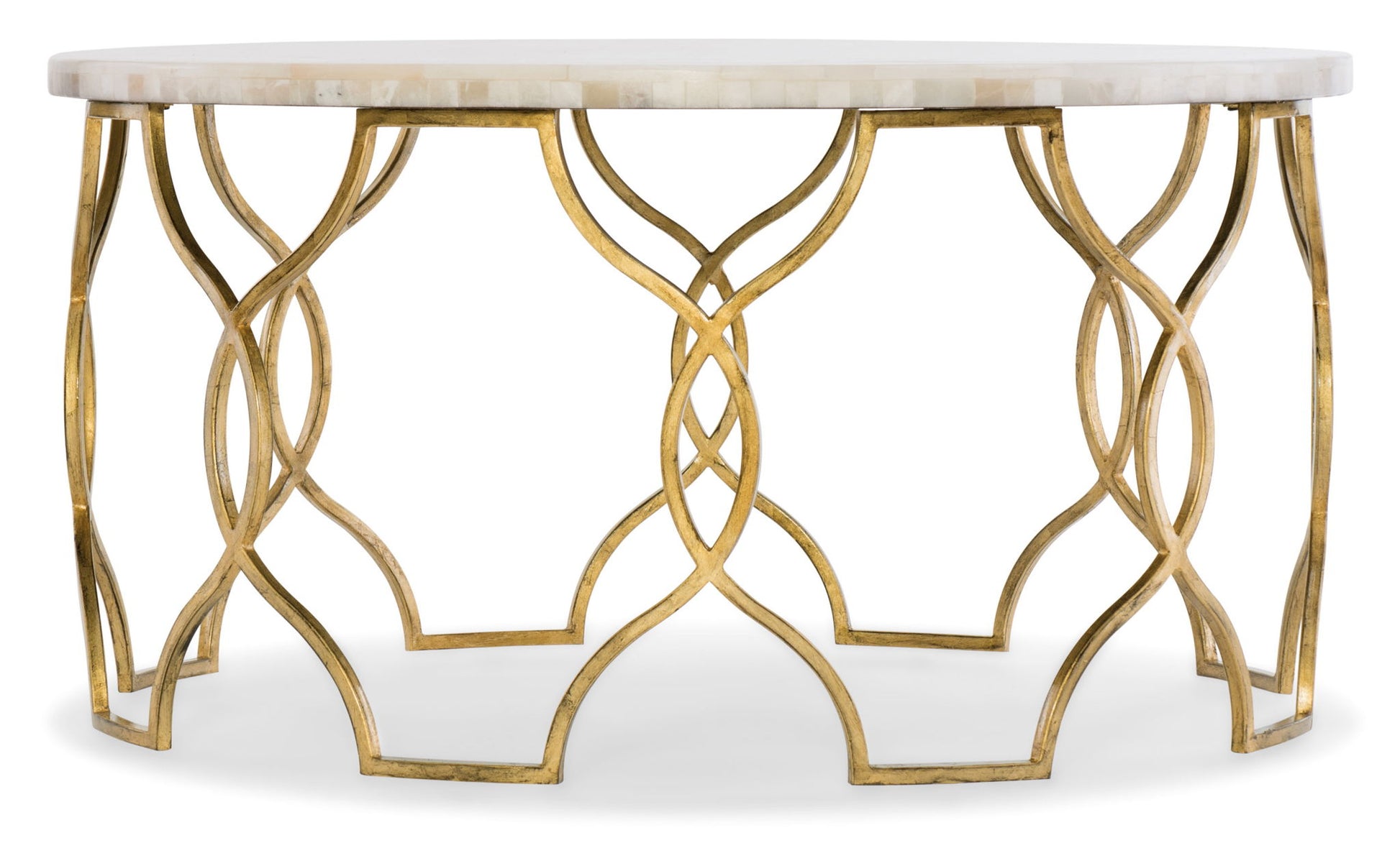 Light and airy, sleek and chic, the Corrina Cocktail Table is distinguished by a delicate fretwork metal base in a gold leaf finish topped by a round white onyx top of organic elegance.