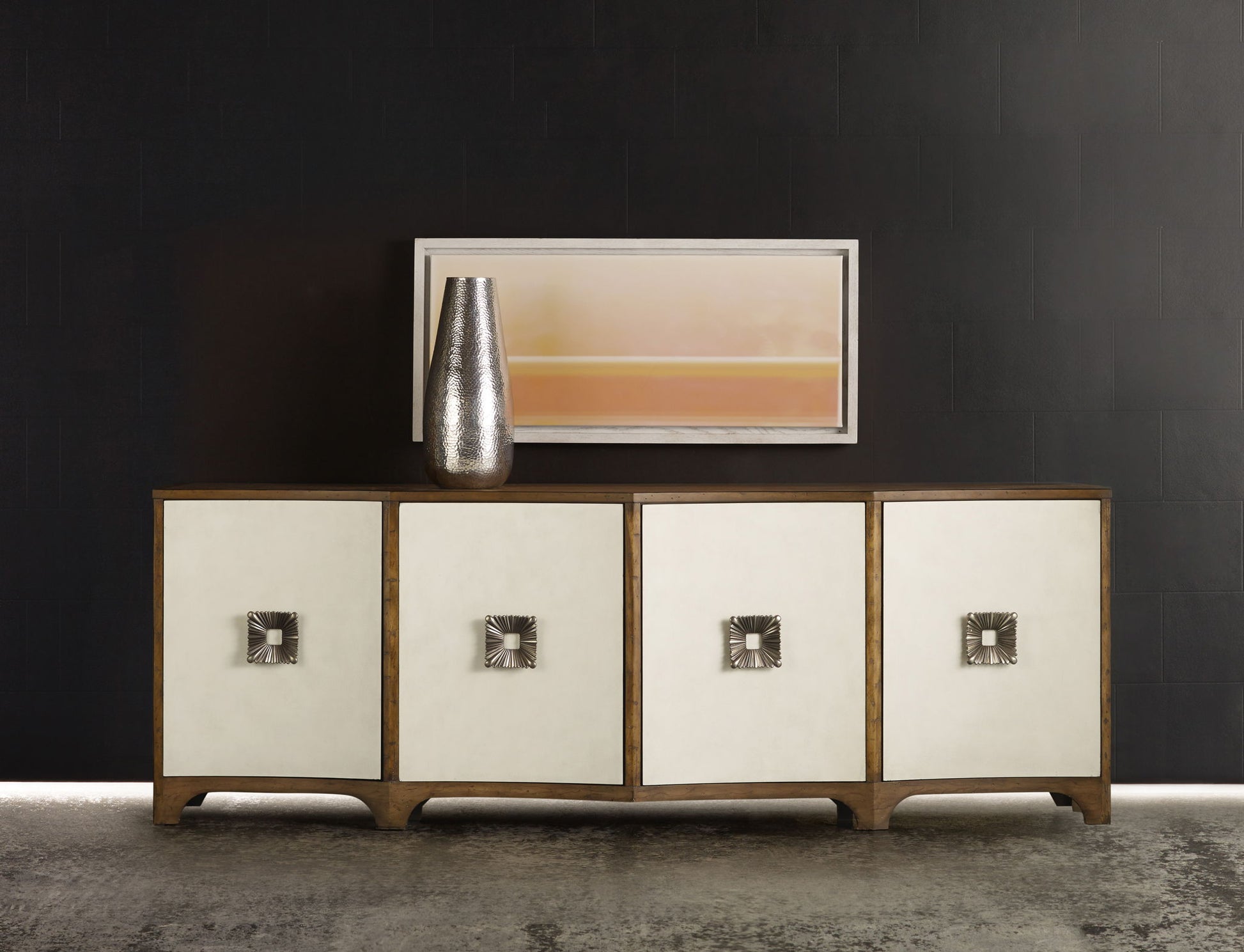 The Mélange credenza has four doors with large square hardware. It can also be used as an entertainment console.