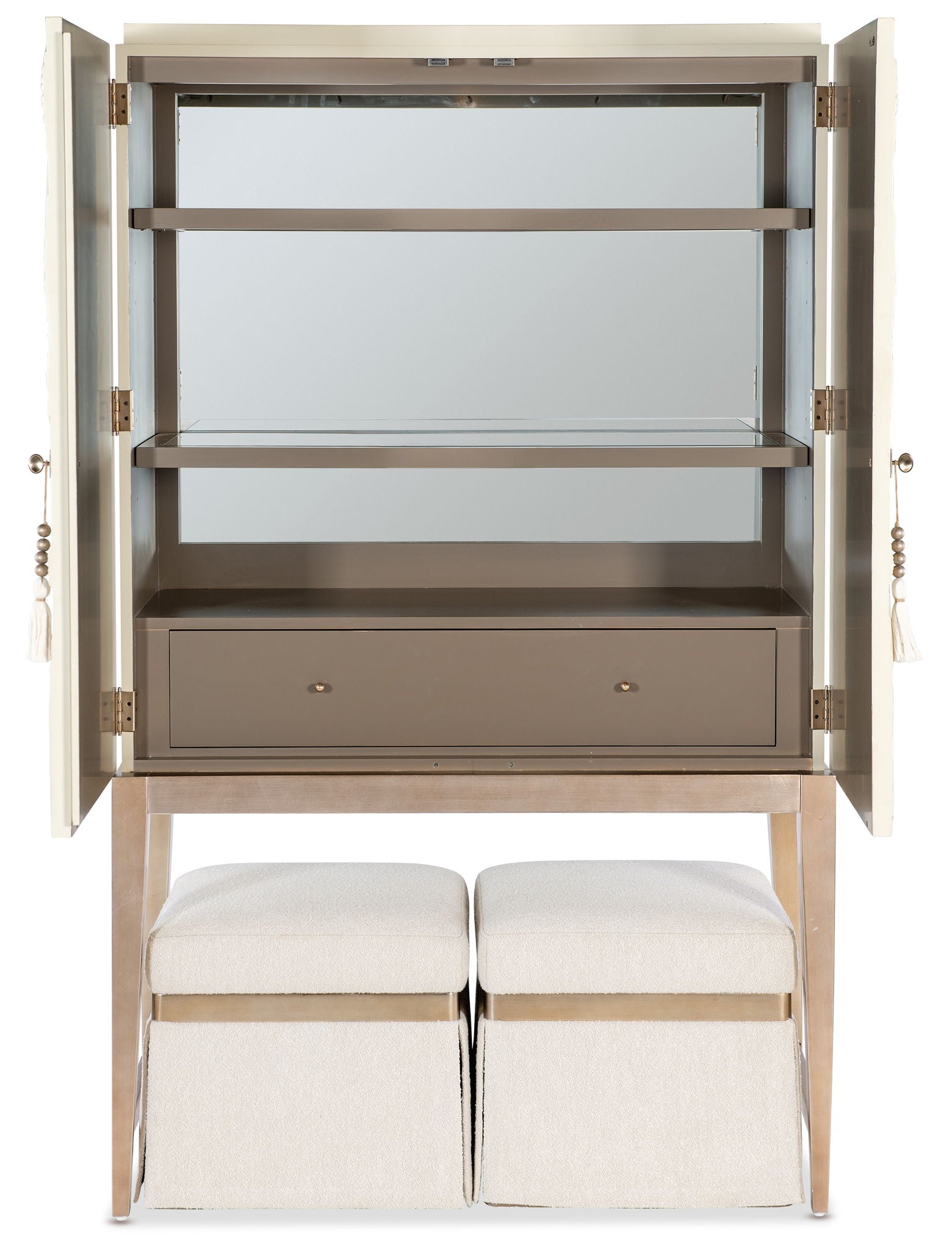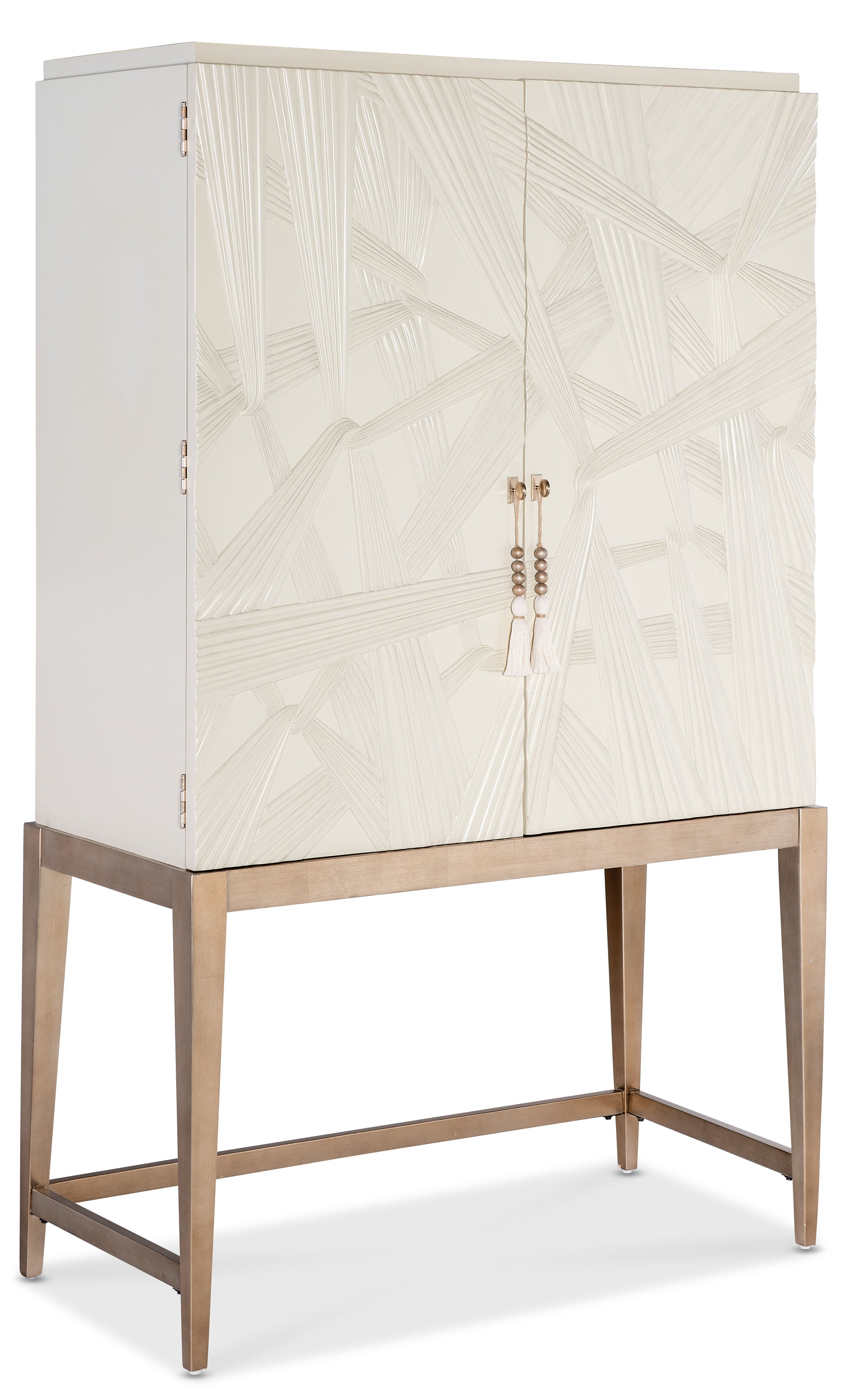 Transform your dining space with the elegant Dream Weaver Bar Cabinet from the Melange collection. Featuring a cream-colored finish with champagne accents, this modern masterpiece includes two textured doors with magnetic closures, a mirrored back panel, and LED lighting. Its two wood-framed glass shelves and a drawer provide functional storage, while tassel accents and tapered legs add a touch of sophistication. Perfectly designed to store bar essentials, this bar cabinet complements contemporary and transitional interiors, making it an ideal choice for entertaining.