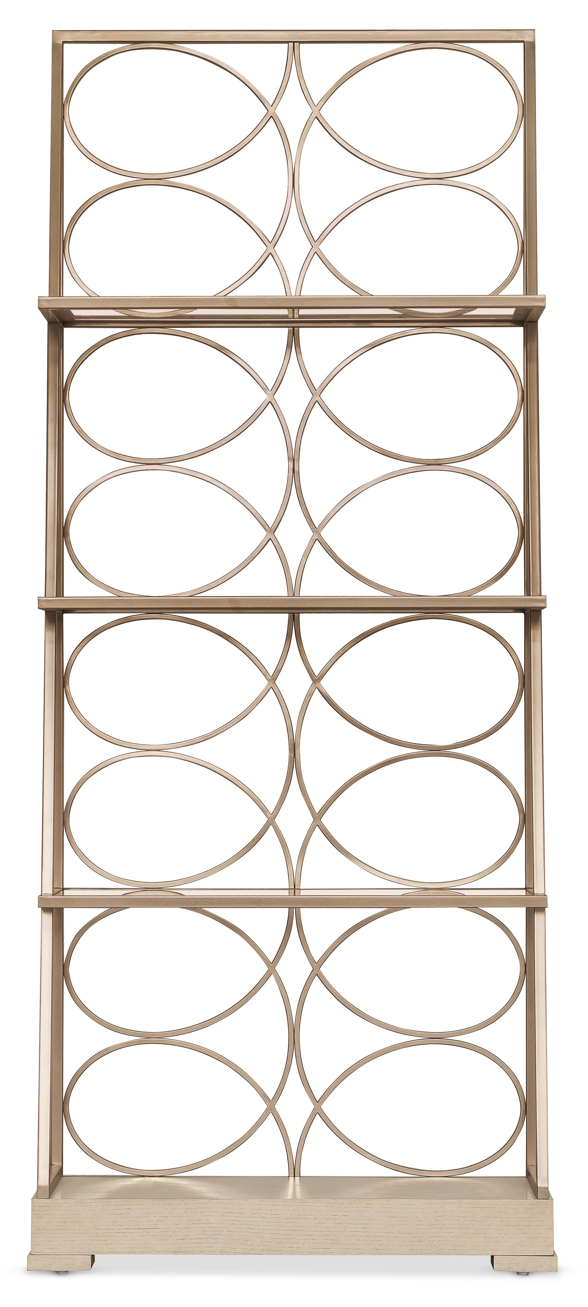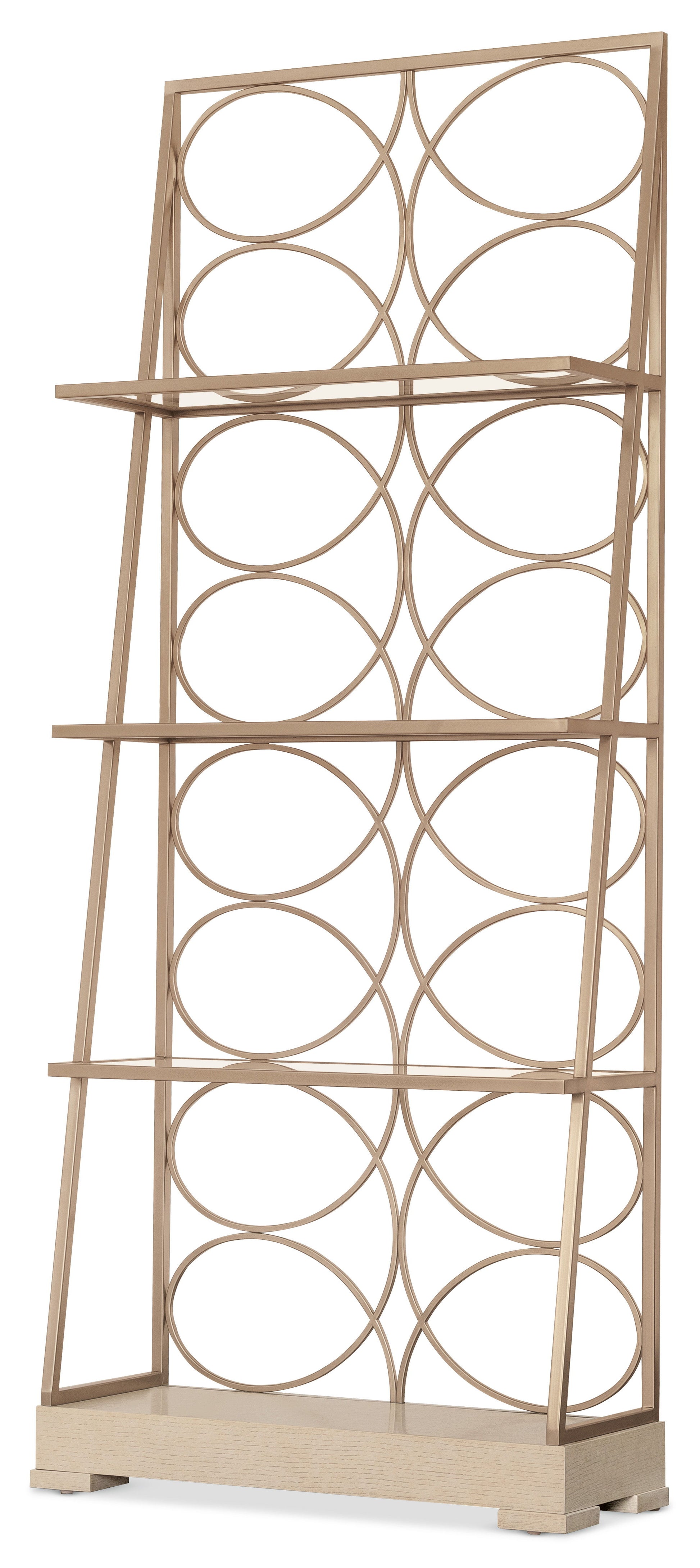 Transform your home office or living space with the Flourish Etagere from the Melange collection. This transitional bookcase features the Polished Limestone finish on oak veneers, an open geometric circle motif, and an angled frame for a modern aesthetic. With three metal-framed glass shelves and a sturdy wood base, it’s perfect for displaying books, decor, or collectibles. The open back and side design create an airy feel, making it an excellent choice as a decorative room divider.