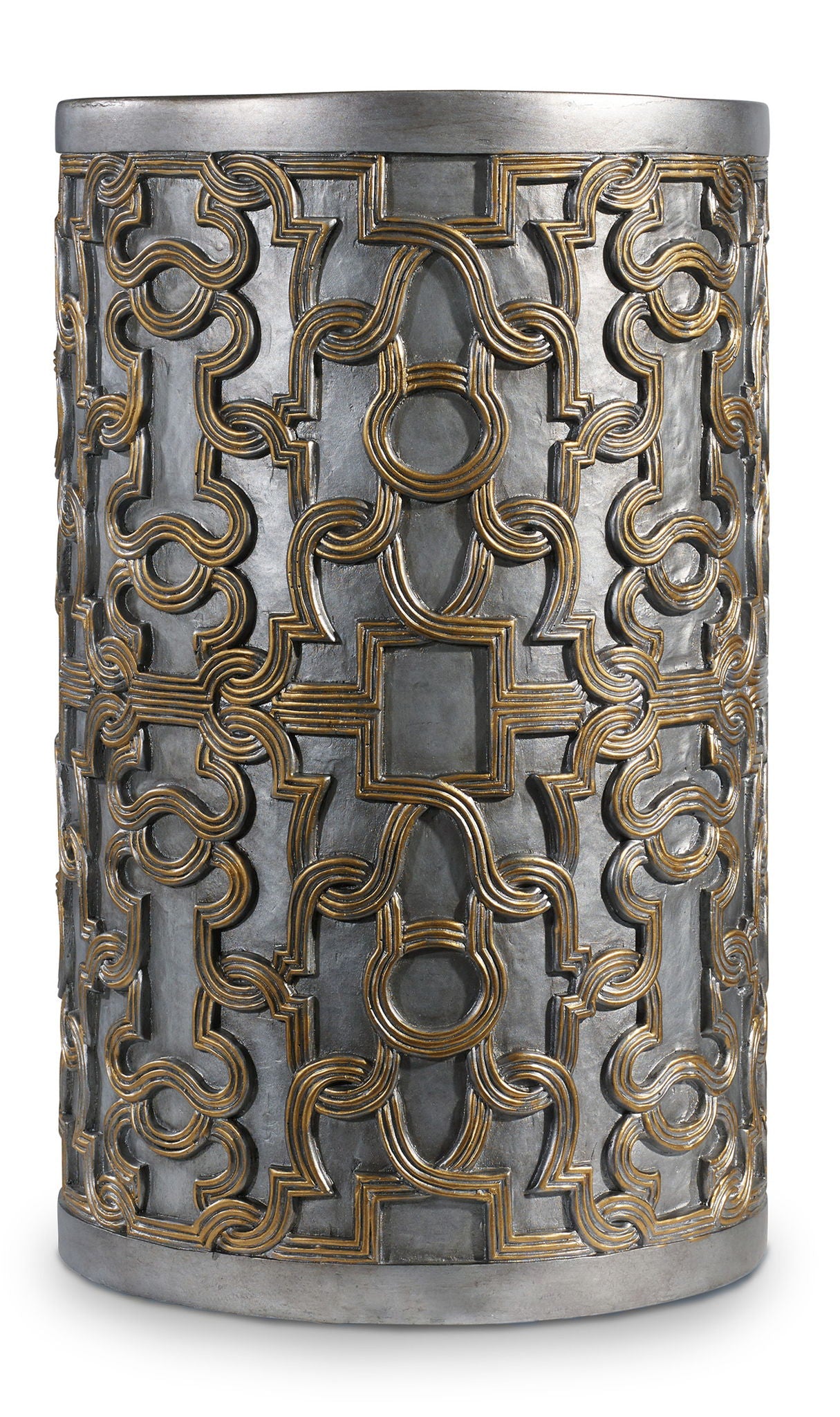 In a marriage of silver and gold, the Gia Drum Table features a dimensional interlocking gold fretwork pattern over a silver base for a glamorous chairside companion.