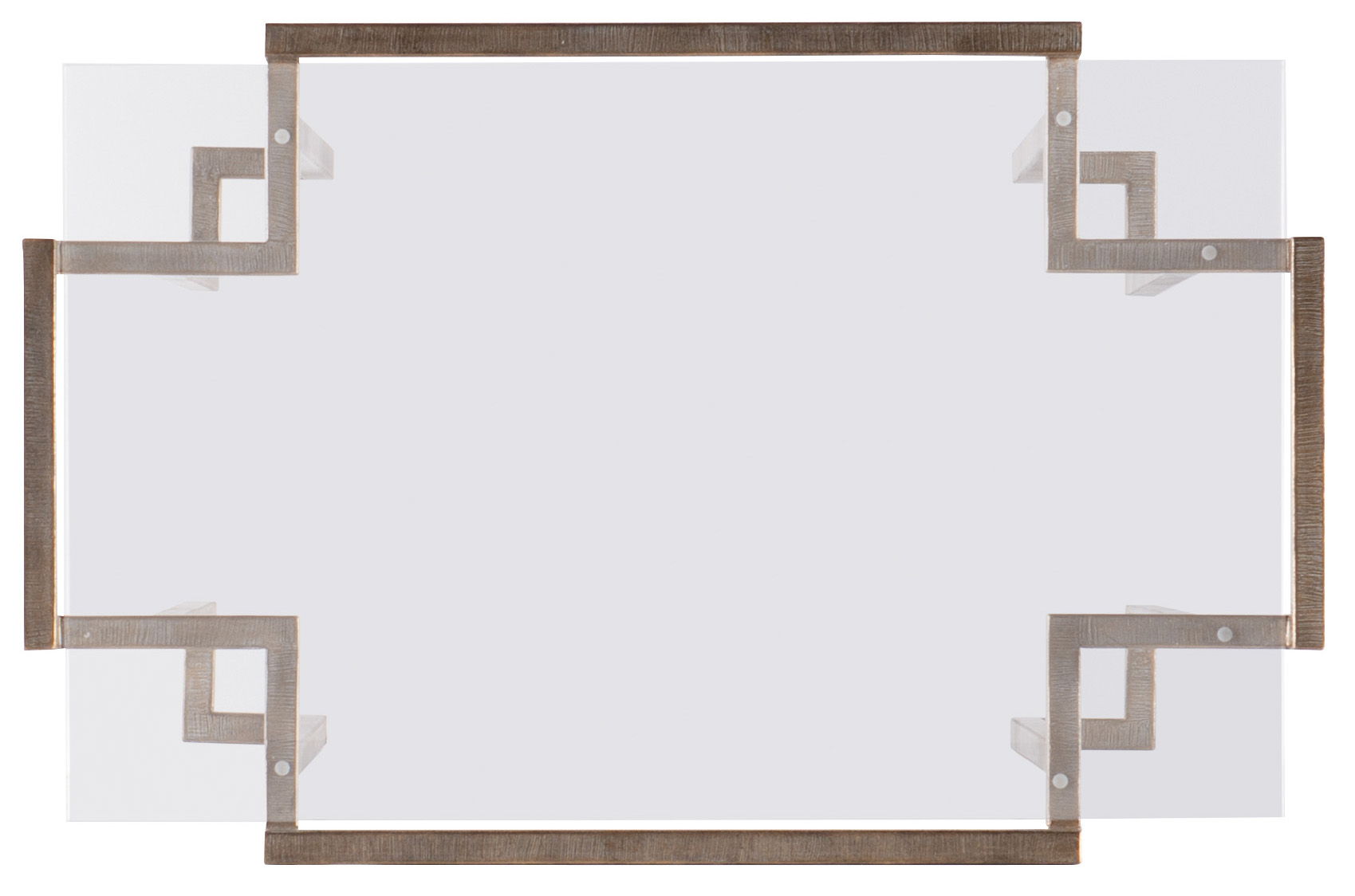 Juxtaposed geometric shapes on the textured metal base and a clear acrylic top give a dimensional and textural appeal to the Grove End Table. Exuding savvy style, the table has an antique brass finish over the textured iron base.