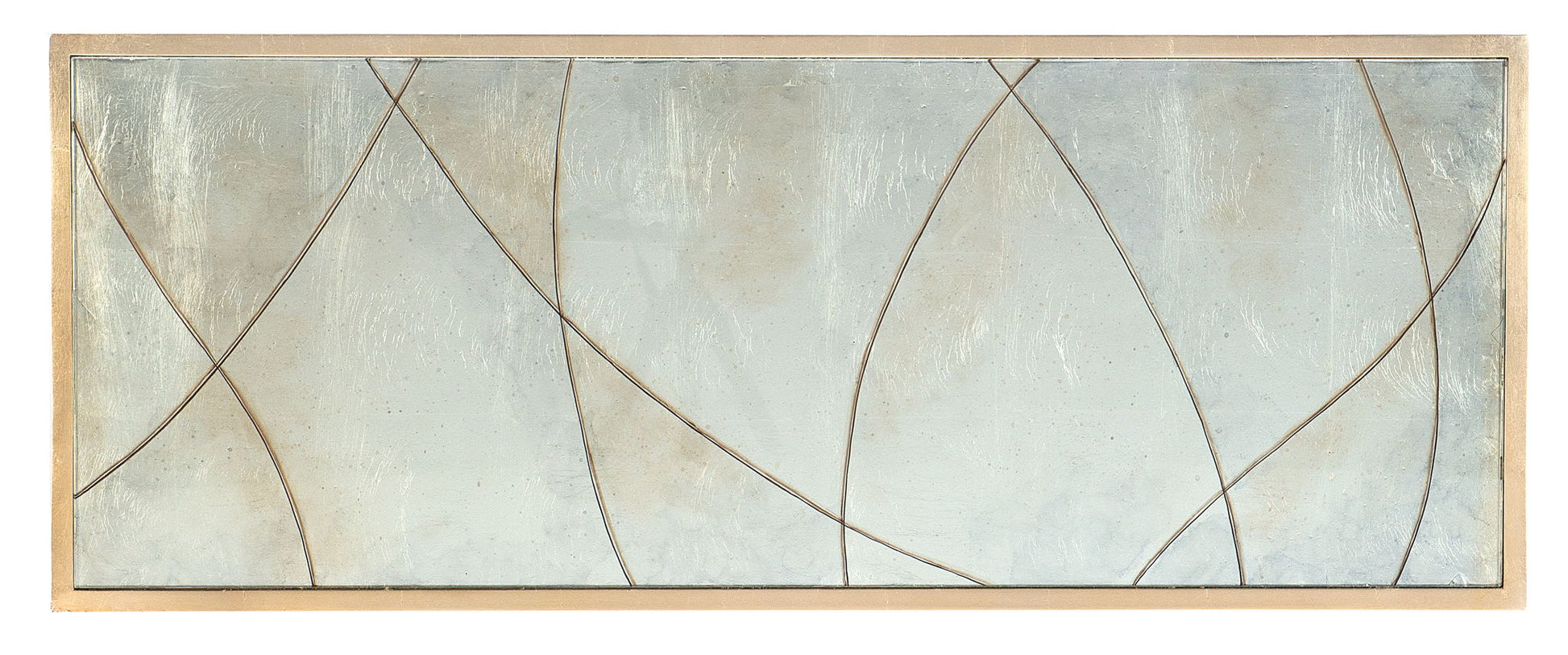 With a delicate organic look, the Joannie Chest has silver leaf eglomise doors featuring a lacey etched pattern, accentuated by a gold frame and base and gray painted interior. The two doors have soft-close hinges and touch latches, with one adjustable shelf behind the pair of doors and a ventilated back panel.