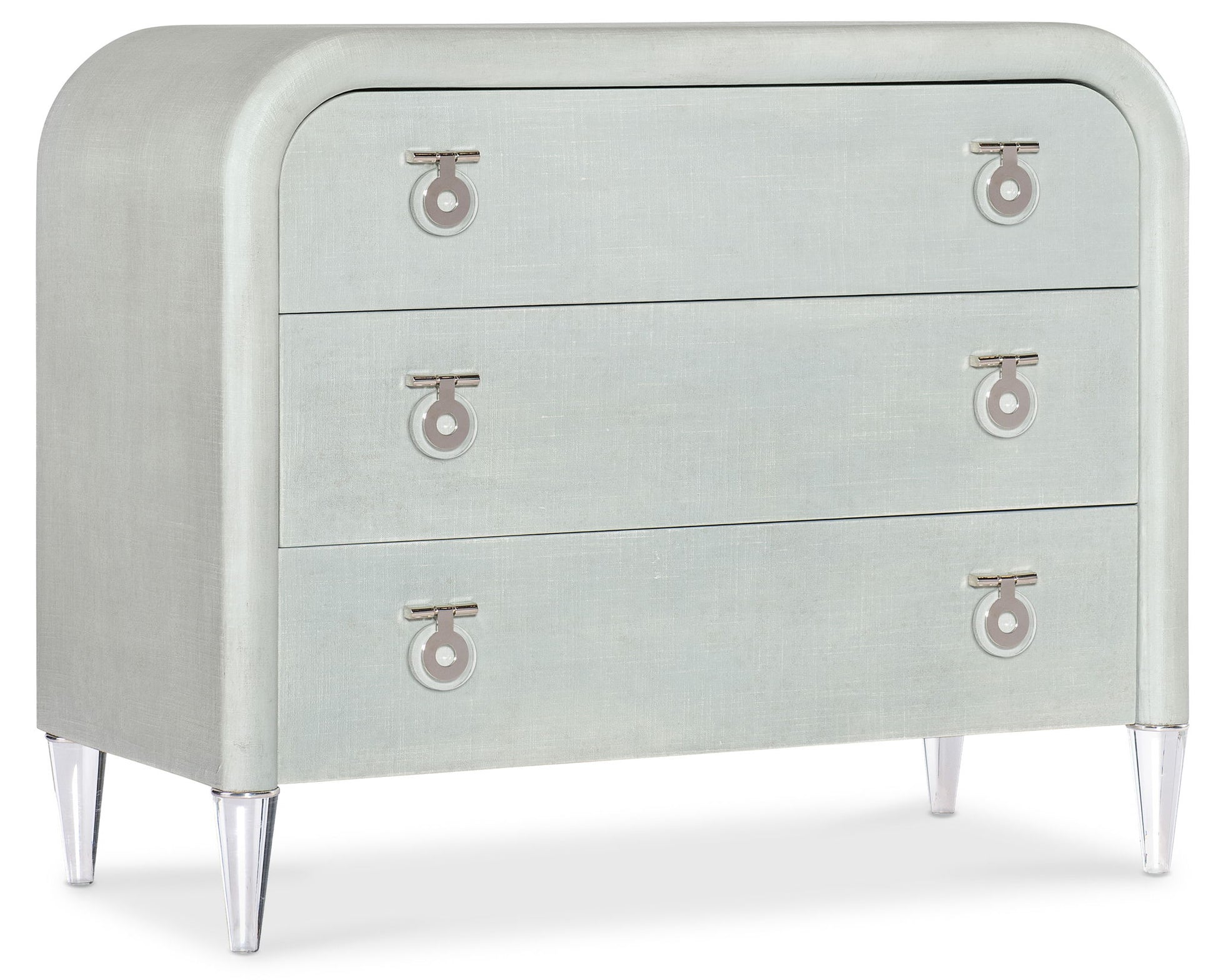 With an understated modern elegance, the Julip Accent Chest is designed with a clean silhouette, clear acrylic legs and metal accents. With a linen-wrapped exterior and drawer fronts and rounded corners, it has chrome-hued, jewelry-like metal drop pulls and three self-closing drawers.