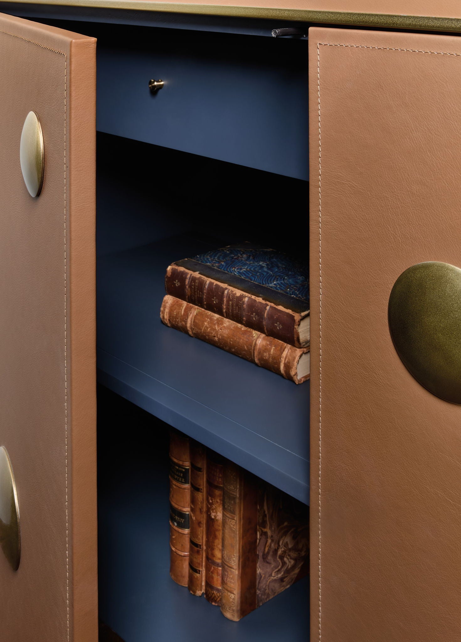 Wrapped in rich brown leather with gleaming gold circle accents, the Lottie Dottie Chest is both chic and functional. Soft-close doors reveal drawers and adjustable shelves—crafted to add couture-level style to any room.