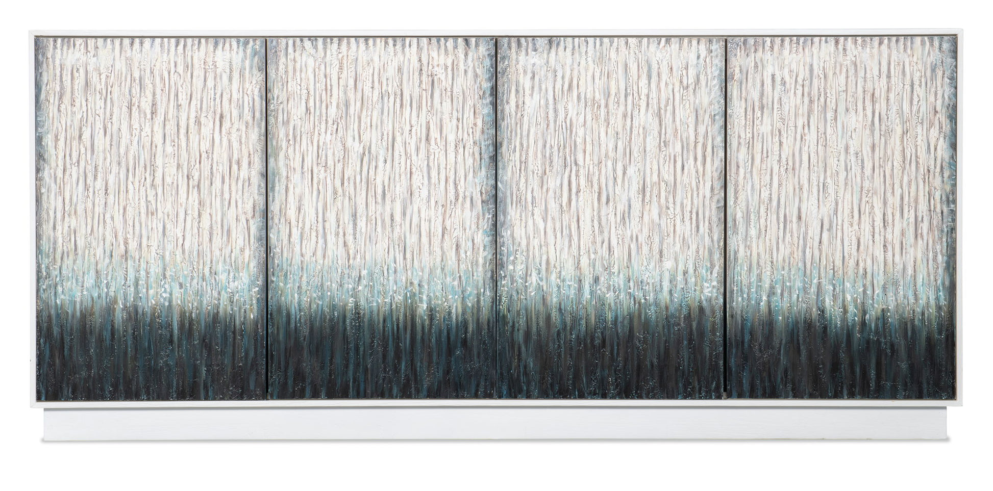 With the allure of an impressionistic painting, the Mediterranean Entertainment Credenza has four white and blue ombre-colored textured door fronts. The interior and case of the credenza is in a soft white. There are two adjustable shelves behind each pair of doors and a 3-plug outlet behind the left pair of doors in the upper right corner. Crafted of Pine and Maple Veneers, the credenza accommodates up to a 75-inch TV.