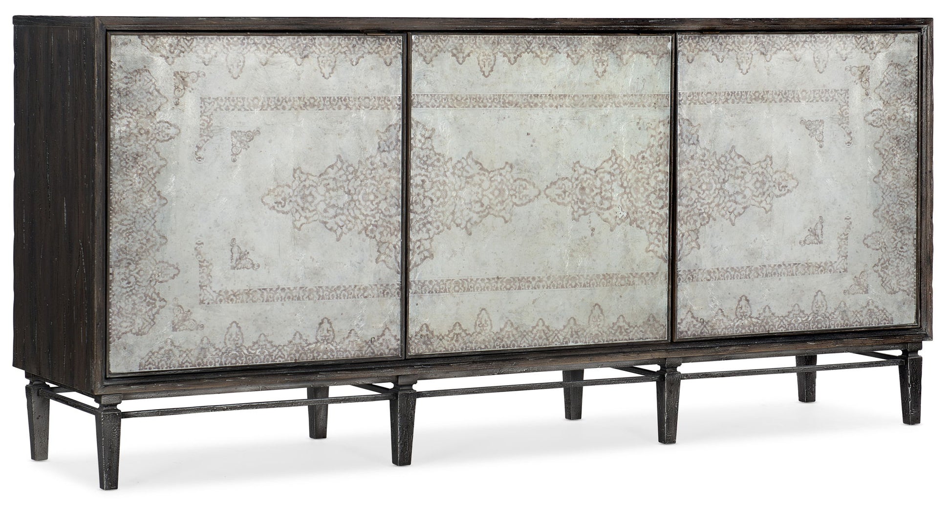 Dark and handsome meets shimmery and romantic with the alluring Rosella Console. Hand-painted eglomise glass with a silver leaf pattern on the door fronts is accentuated by an oak veneer case and legs in a rich dark finish. Three doors with soft-close hinges with 2 drawers behind the left door and 2 shelves behind the right pair of doors. Ventilated back panel in the right section to make this piece electronics-ready.