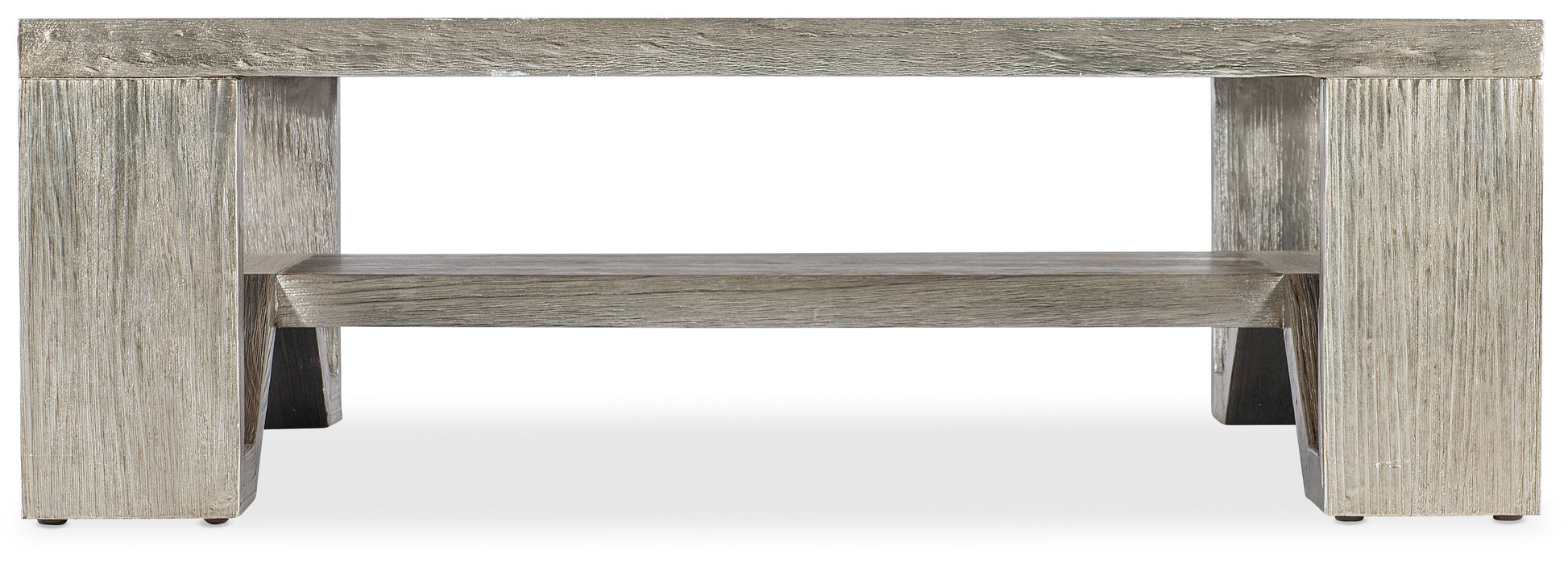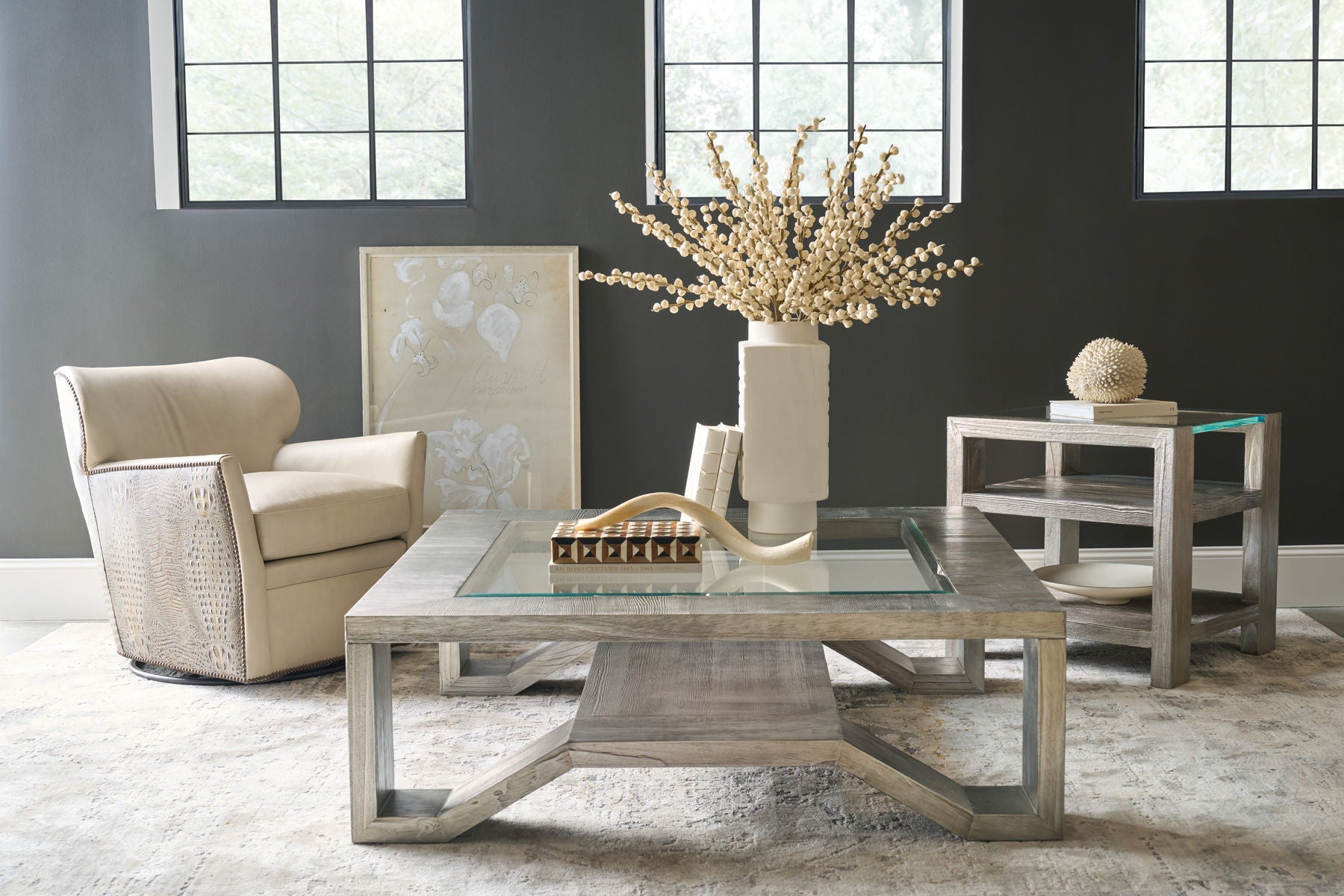 Angles flow gracefully and artfully in the Saber Cocktail Table design. With an overall square shape, the table is crafted of Pine Veneers with a chic silver leaf finish and a drop-in tempered glass top. One fixed shelf.