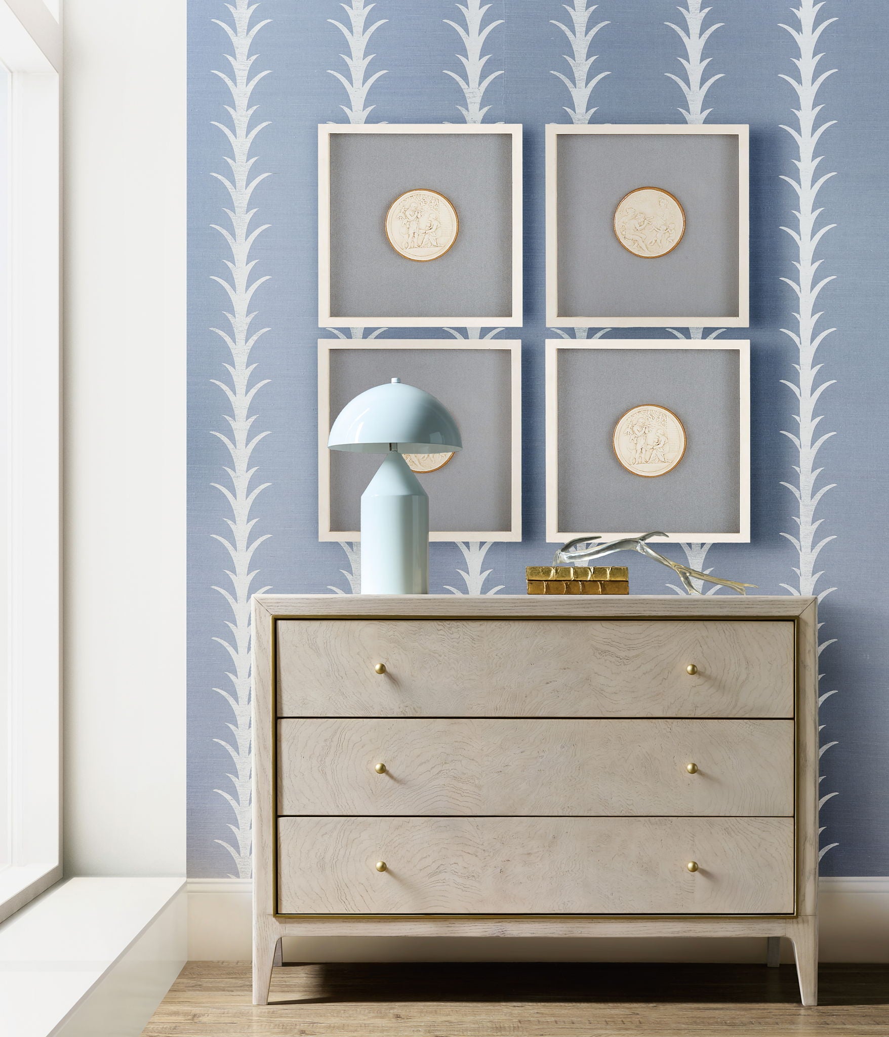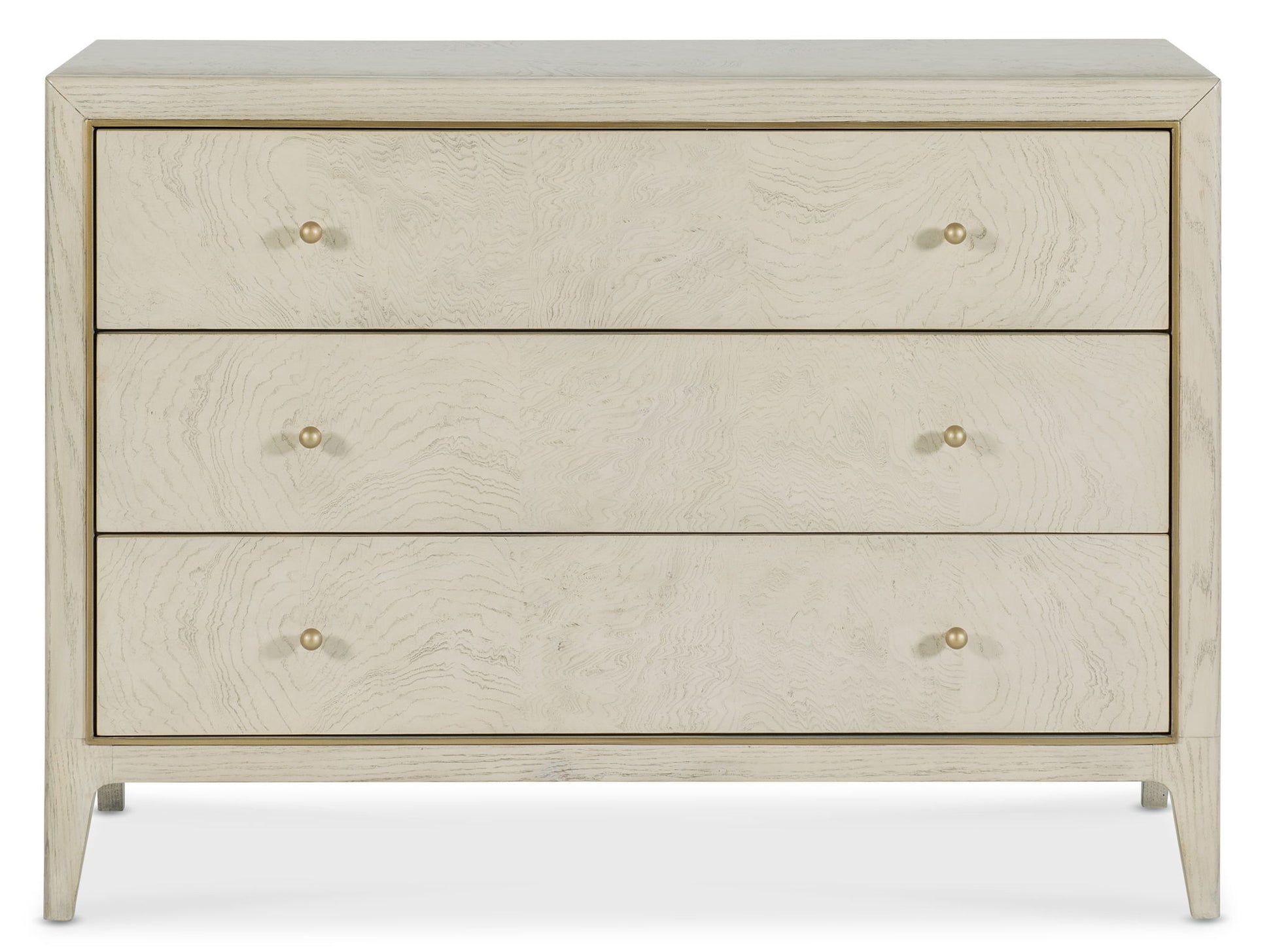 A blend of romantic curves and refined finishes, the Wanderlust Chest is crafted from ash burl veneers in a light greige hue, accented by gold trim and tapered legs. Three self-close drawers make it as practical as it is beautiful.