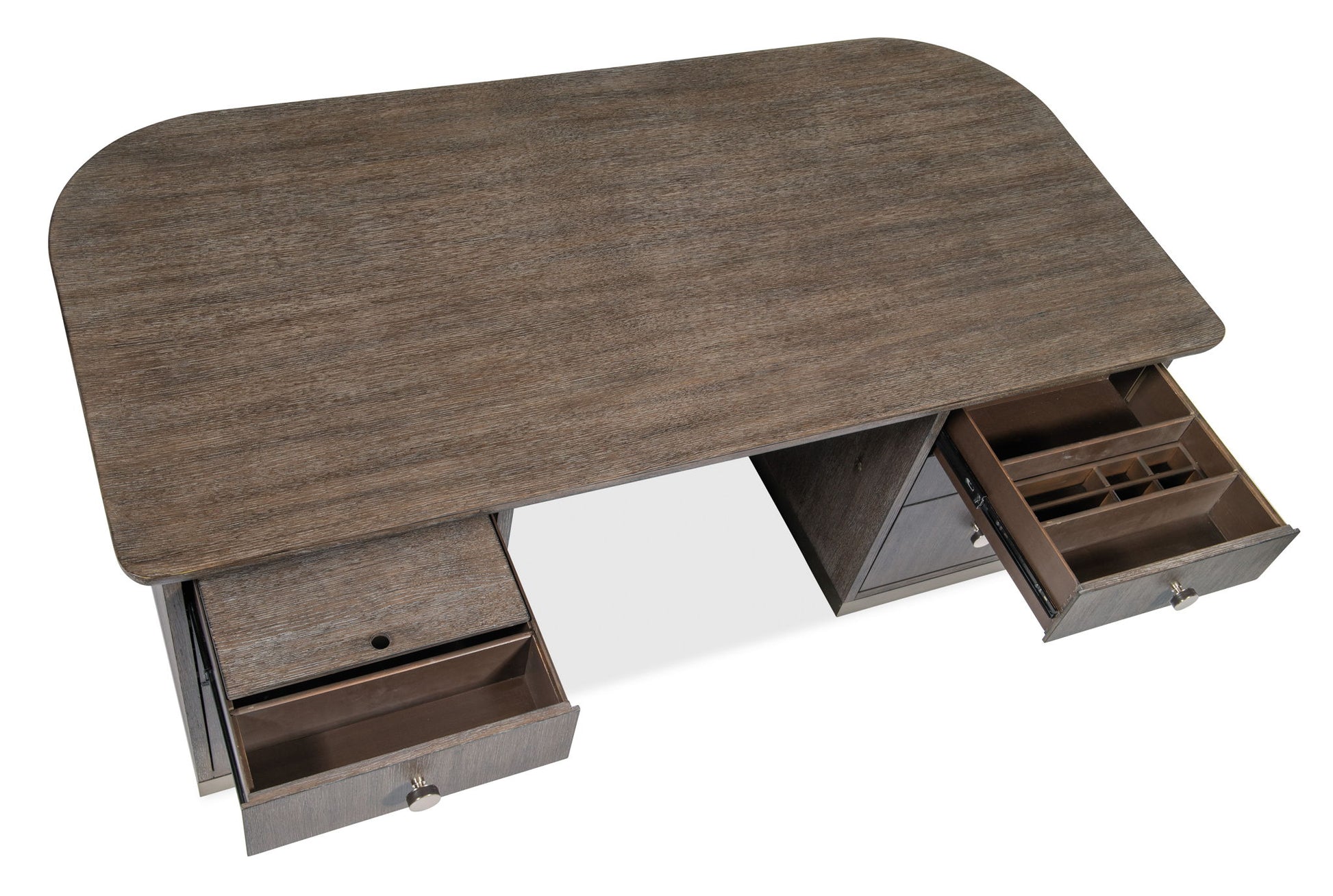 Offered in a clean and unmistakably modern aesthetic that transcends time, the Modern Mood Executive Desk is a statement piece packed with functional features. The Diamond Finish over wire-brushed Quartered Oak Veneers with crystal-like alabaster and pewter hues delivers a soft sophistication, while the metal banding and edging on the base and round metal knobs wrapped in leather offer a mixed-media eclecticism. Features include two locking file drawers with Pendaflex letter/legal filing system, 4 utility drawers, two top left drawers with removable dividers and a top right drawer with removable mouse pad and pencil tray that can be used in either side top drawer. There are locks on the inside of the kneehole area and levelers.