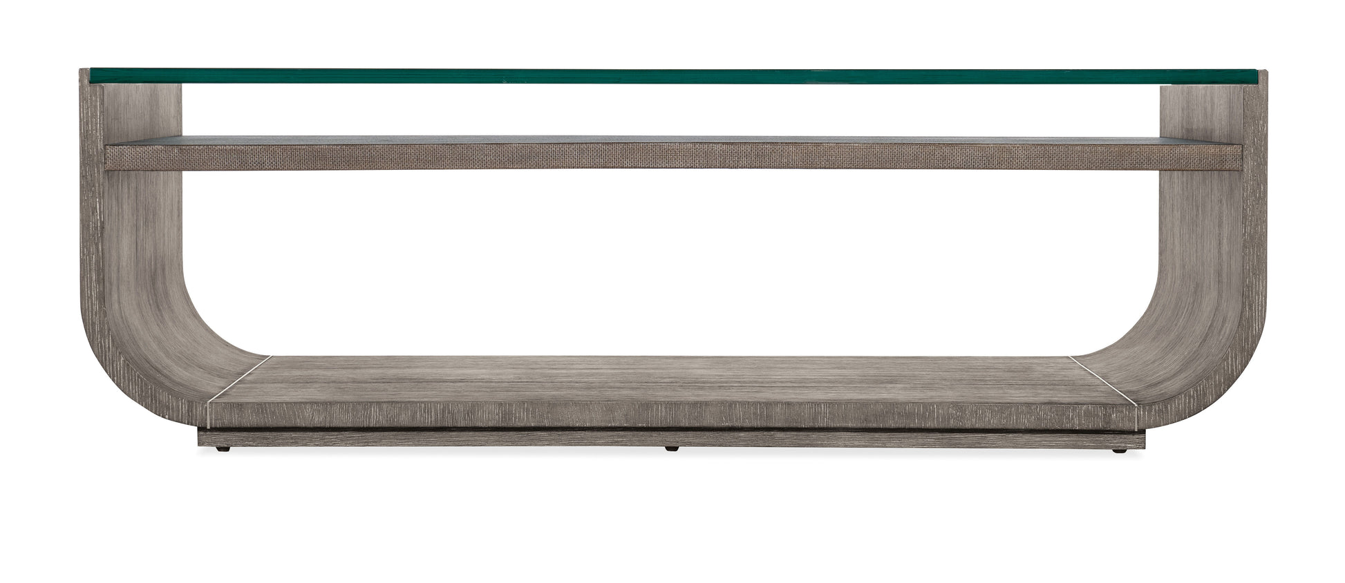 Architectural and timeless with a luxe mixture of materials, the striking Modern Mood Rectangle Cocktail Table has a raffia-wrapped shelf beneath a one-inch-thick tempered glass top. With rounded sides, the table is crafted of Oak Veneers with tactile wire-brush detailing in a light Diamond finish with crystal-like alabaster and pewter hues, offering soft sophistication.