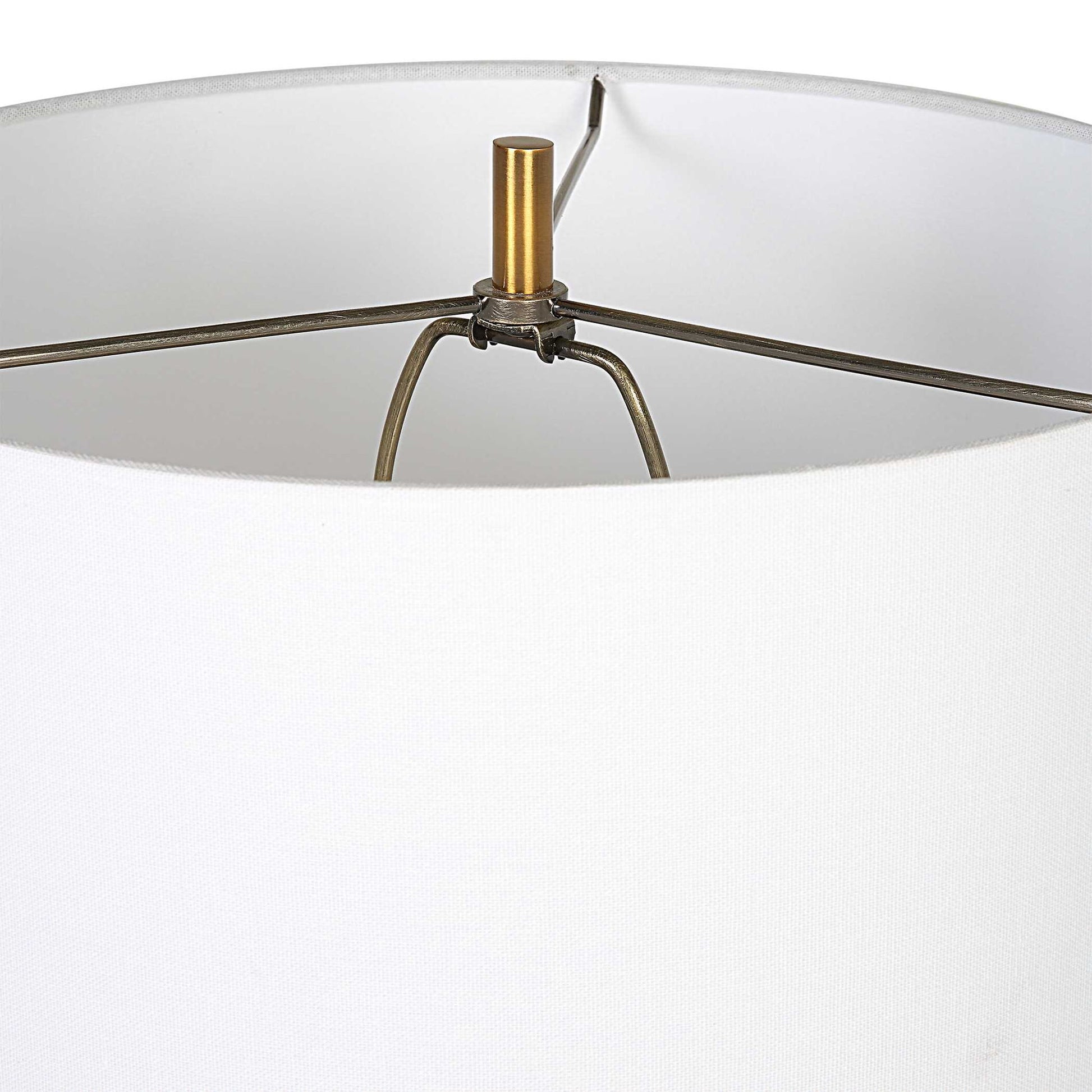 This Ceramic Table Lamp Showcases A Rustic Chiseled Texture With Frosted Pewter Gray Undertones And Organic Carved Accents In Light Sepia Tones. Iron Details Are Finished In Antique Brass. The Lamp Is Complimented By A White Fabric Drum Shade.