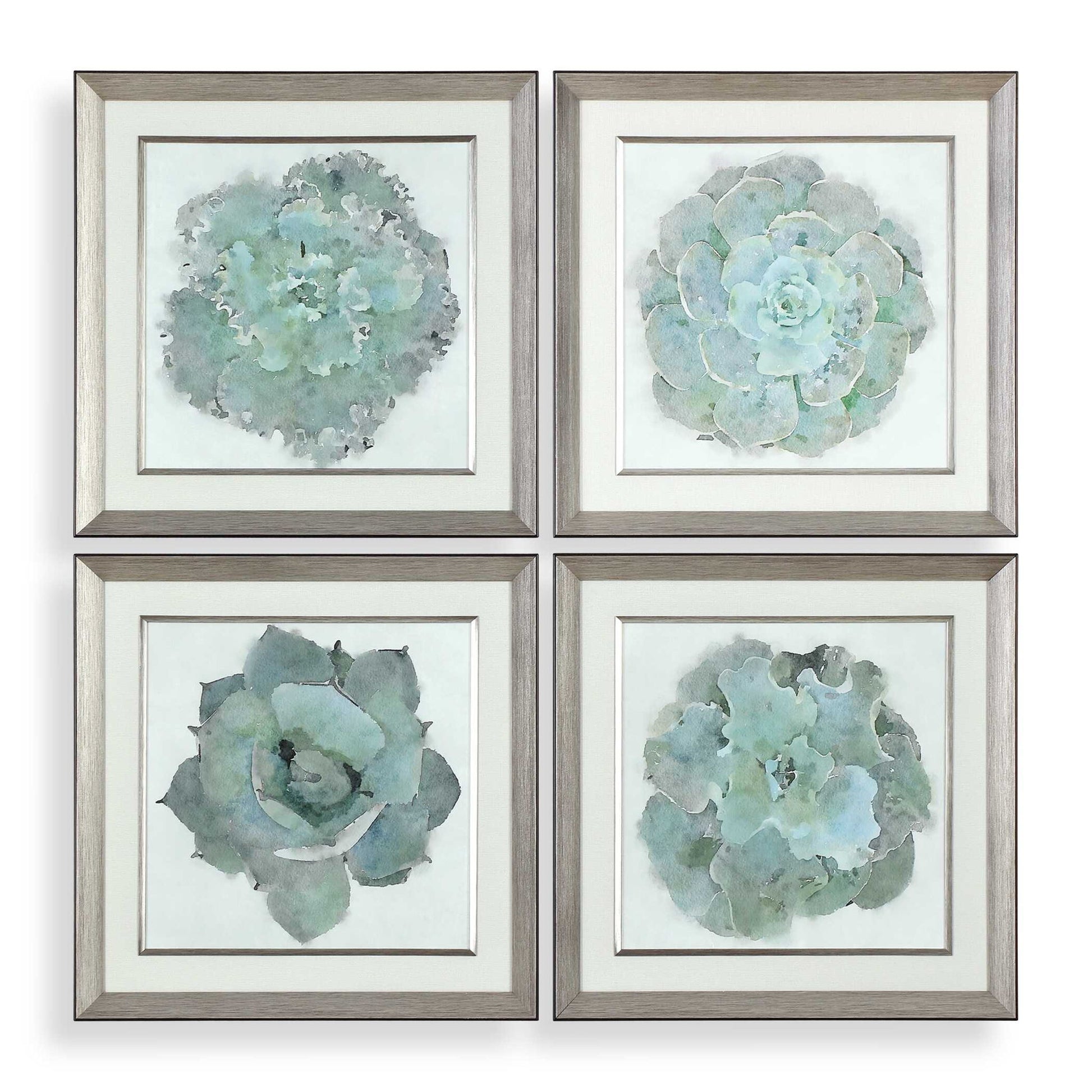 These Printed Succulents Exude On-trend Style And Artful Appeal. Shades Of Green And Gray Create A Simple, Yet Eye-catching Design. Each Print Is Accented By A Warm, Neutral-toned Mat. Silver Leaf Frames With A Light Gray Wash And Scratched Accents Are Paired With Matching Fillets To Complete The Artwork. Each Print Is Set Under Protective Glass.