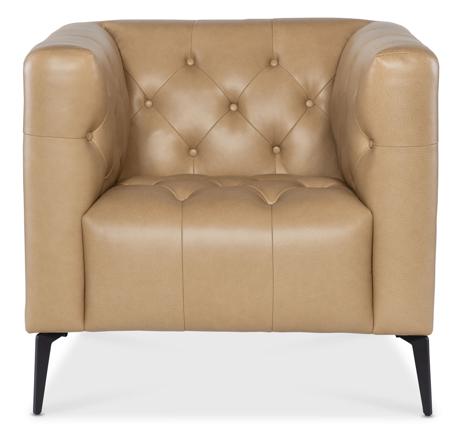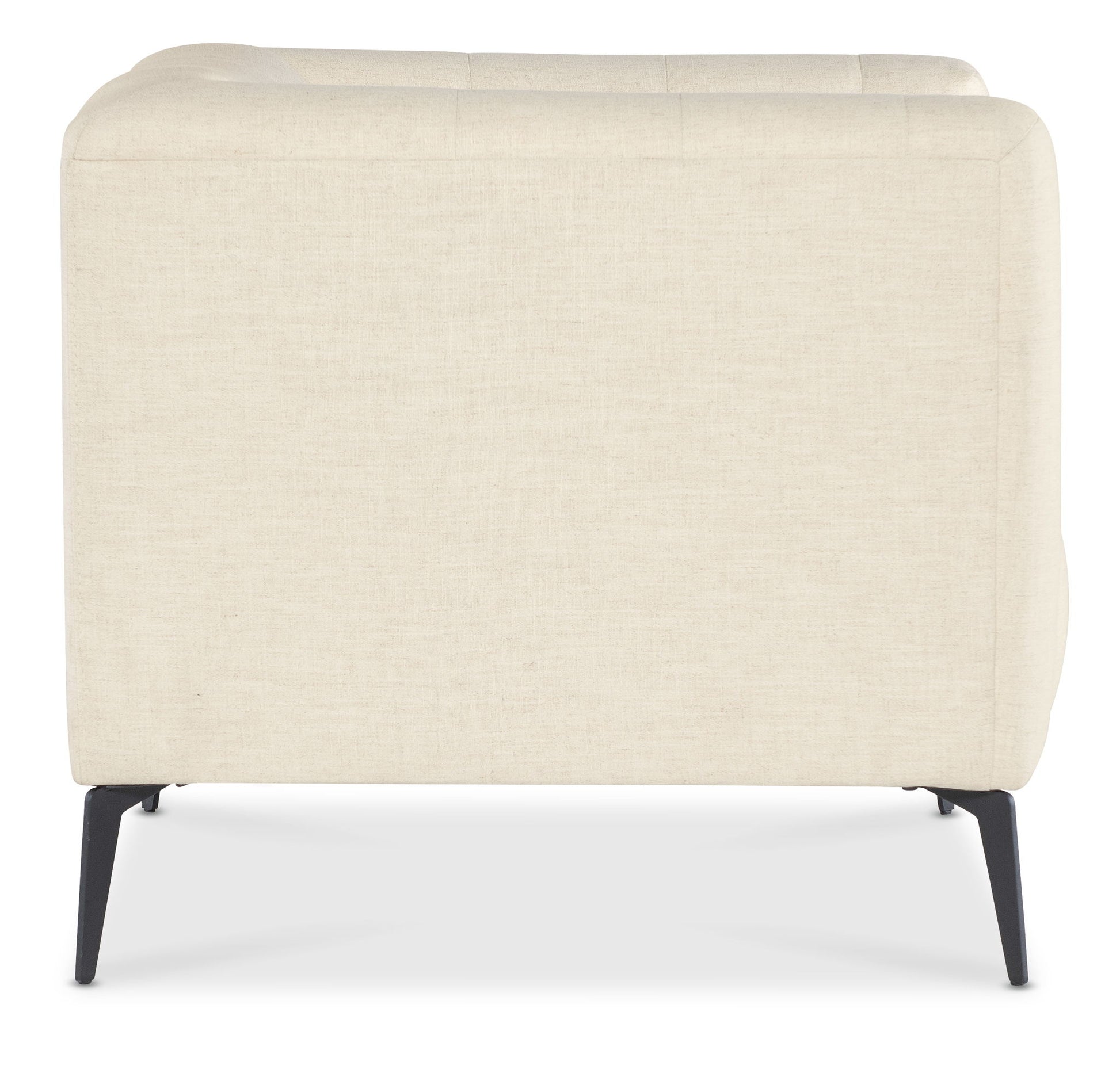 The Nicolla Stationary Chair in performance offers a stylish, modern traditional design. With a chesterfield-inspired shelter arm design and button tufted interior, the chair stands out with its light, airy appearance, thanks to tall metal tapered legs.