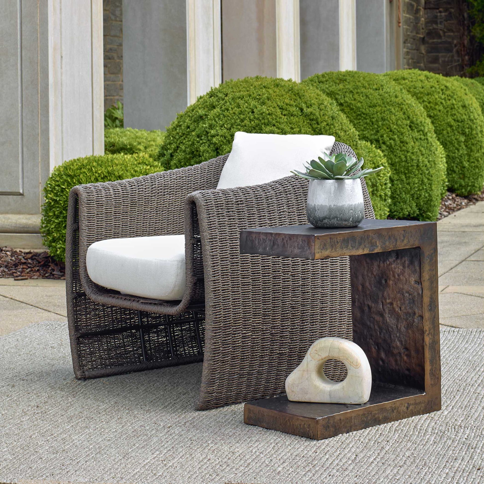 This Side Table Showcases A Hammered Textured Aluminum Frame In A Captivating Golden Dark Bronze Finish. Its Simple Yet Stylish Design Makes It Perfect For Any Outdoor Space, While Its Sustainable Construction Ensures Years Of Enjoyment.