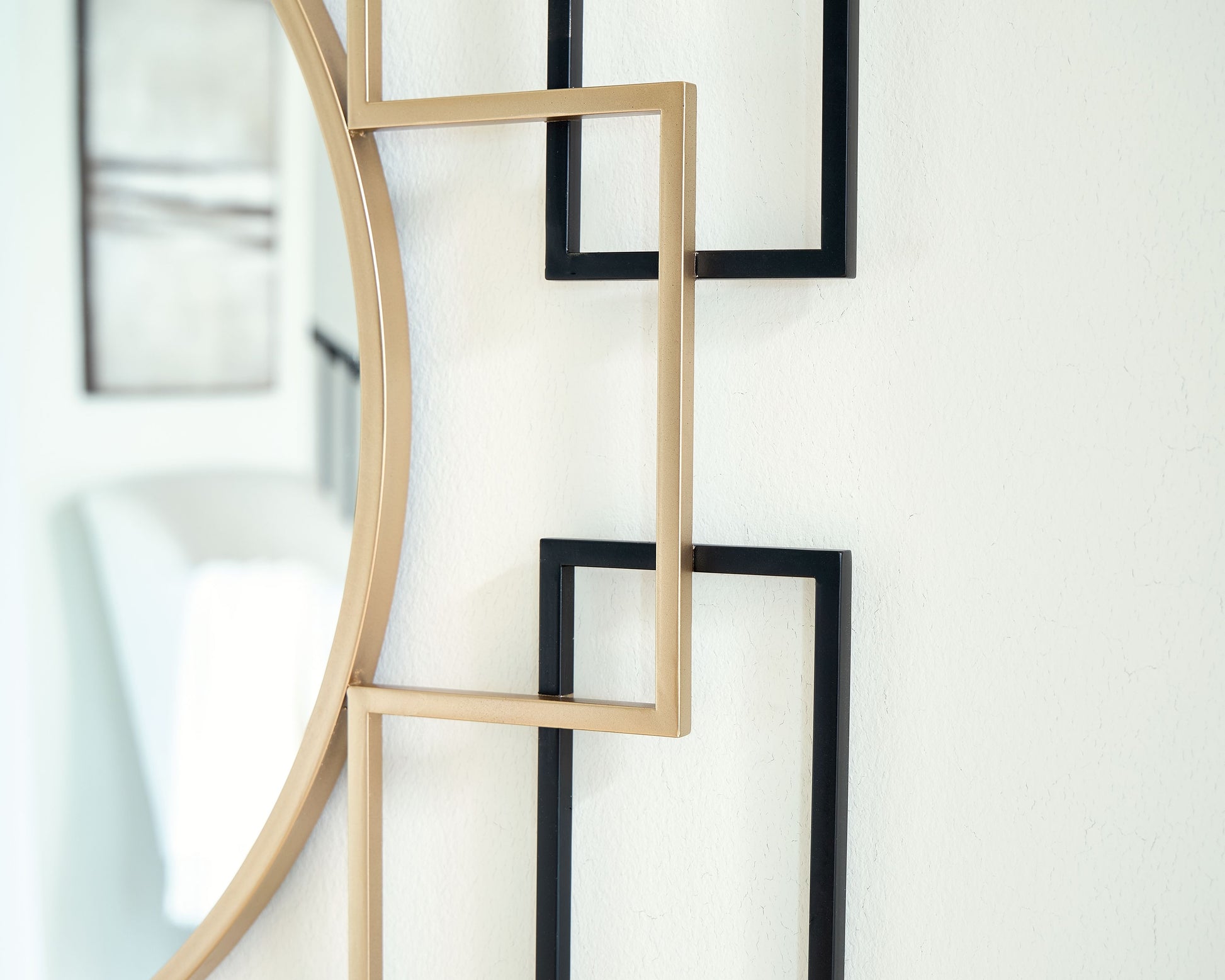 This accent mirror brings a layer of contemporary flair to traditional art deco motifs. Its frame, in a geometric design emphasized by black and goldtone finishes, makes a strong sculptural statement. What a sleekly stylish addition to a living room or entryway.