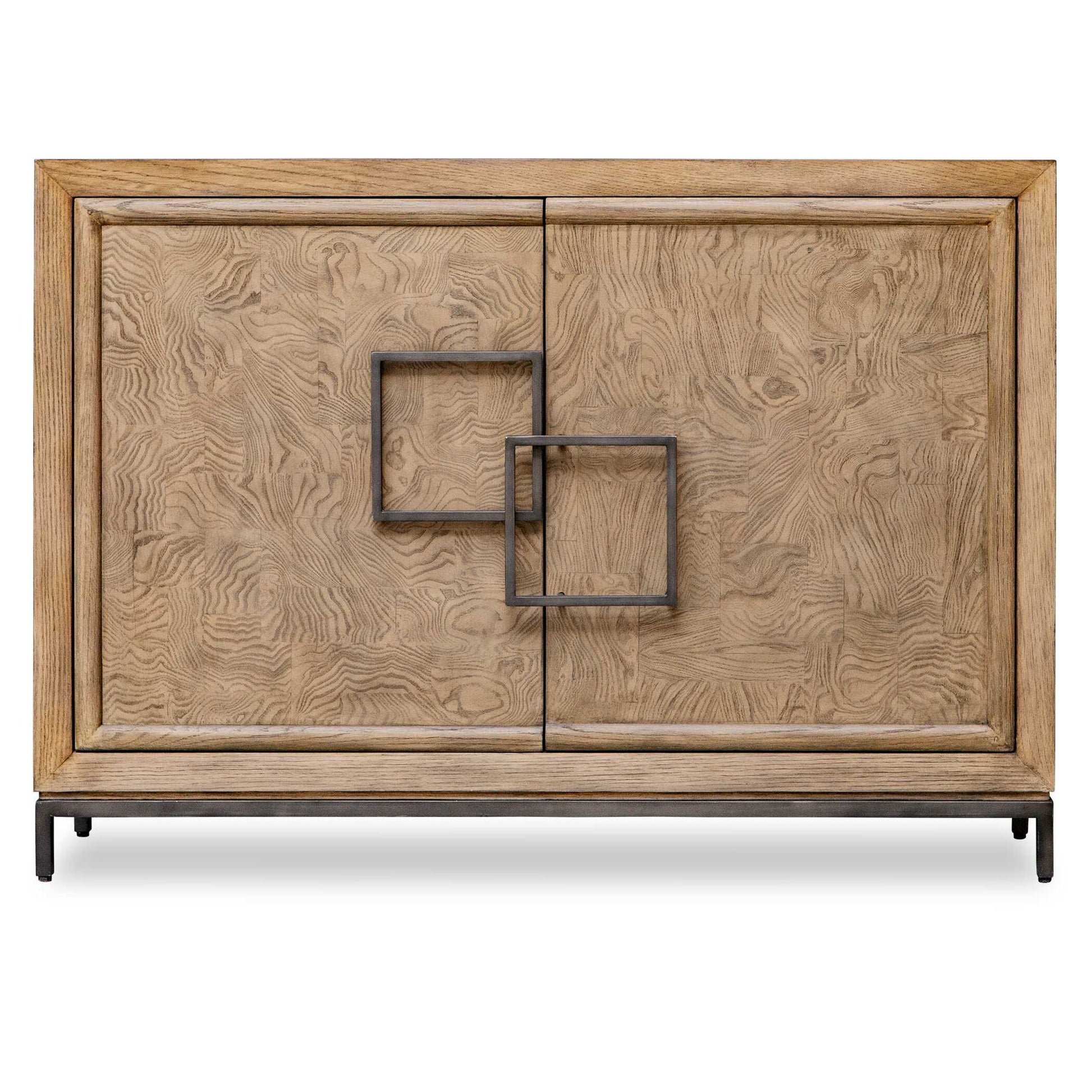 This Two Door Chest Combines Rich Burl Veneer And Oak Wood, And Is Highlighted By Distinctive, Asymmetrical Oil-rubbed Bronze Steel Framed Door Pulls. This Piece Offers A Striking Contrast To The Textured Wood, Bringing A Refined, Contemporary Feel That Is Sure To Compliment Any Space.